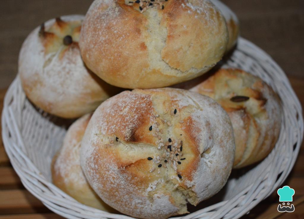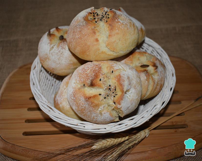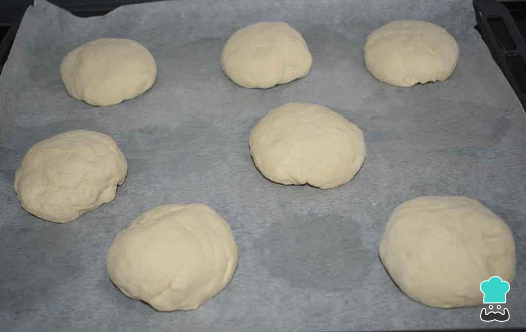 Depois do tempo indicado polvilhe farinha em uma superfície de trabalho e abra a massa aí, polvilhando-a com um pouco mais de farinha. Amasse, separe em pedaços de tamanho igual e volte a amassar, abrindo a massa, dobrando as pontas para o centro e modelando em pãezinhos redondos. Deixe repousar por 30 minutos em um tabuleiro com papel manteiga.