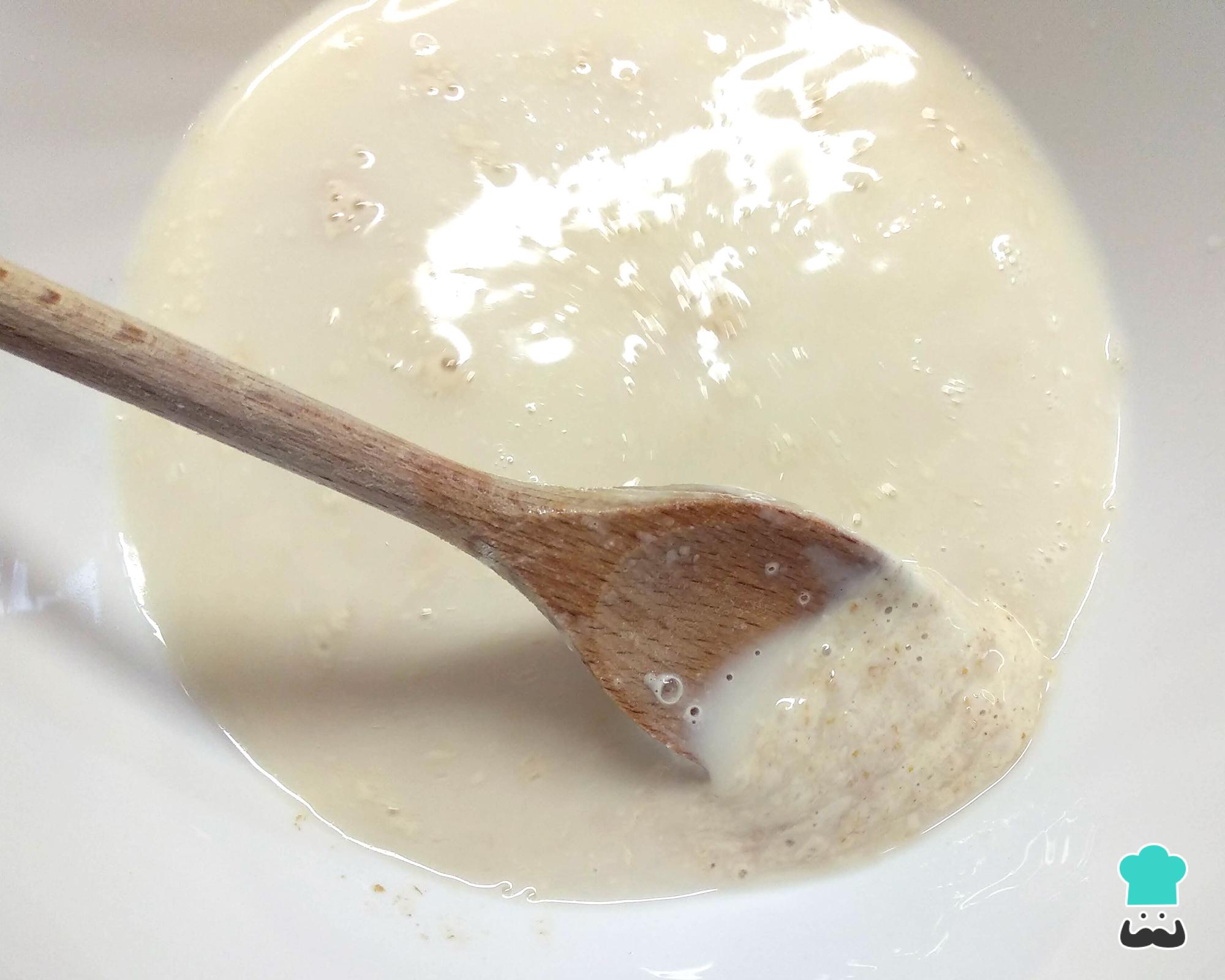 Coloque a água numa vasilha e dissolva o fermento caseiro nela, usando uma colher de pau.