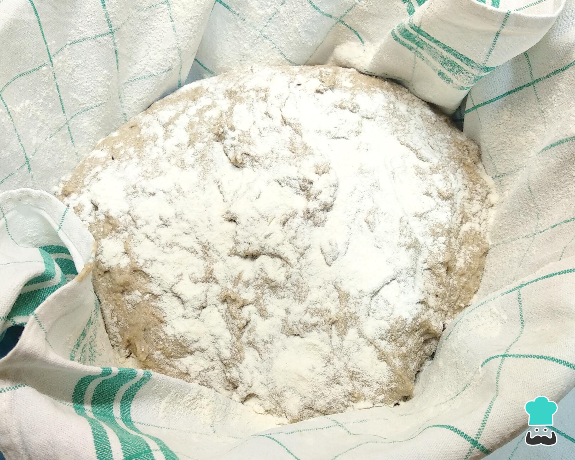 Após as dobras, a massa já estará mais consistente e elástica. Transfira-a para um cesto de fermentação (banneton), polvilhado com farinha, ou para uma vasilha forrada com um pano e também polvilhada com farinha, como na foto. Cubra com um pano e reserve por 2 horas em um local ameno e abrigado, para que a massa cresça.