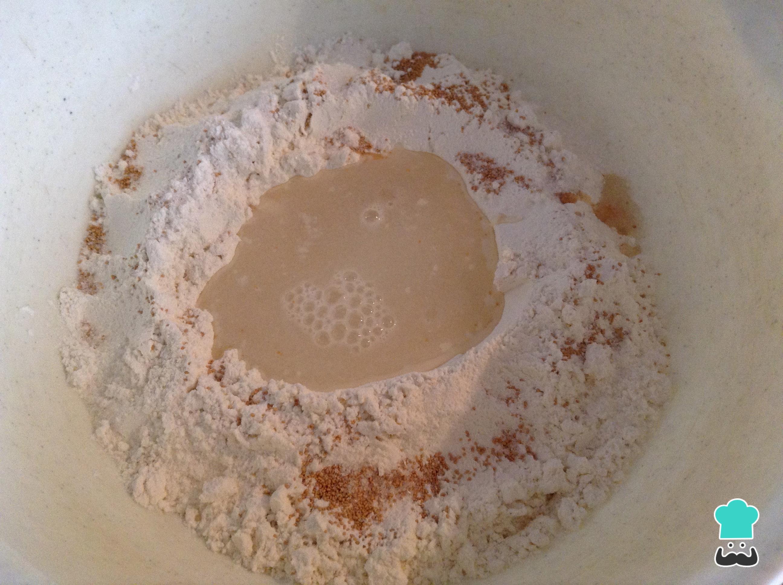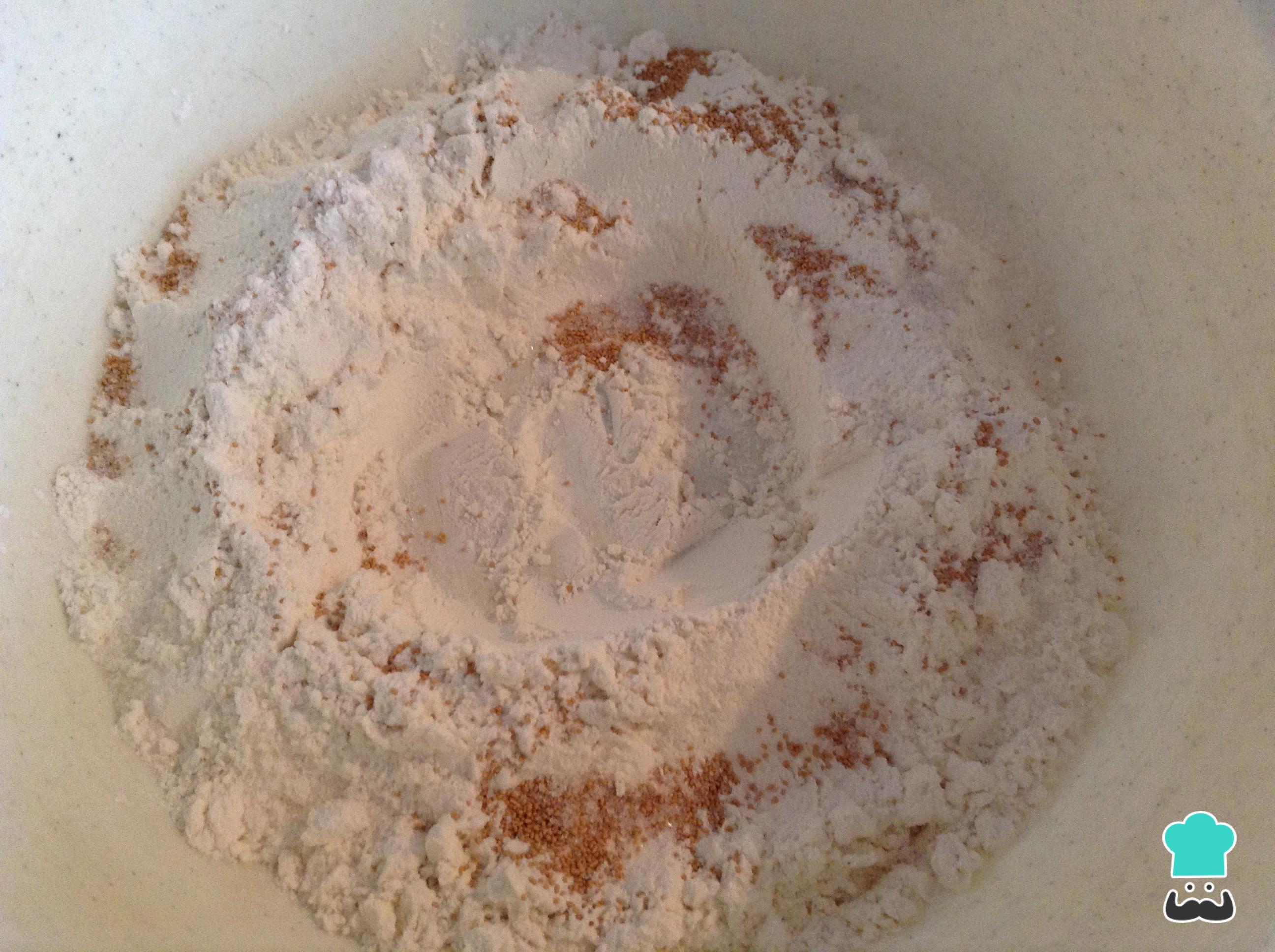 Coloque em uma tigela a farinha, o fermento e o sal. Abra uma cova no centro, que será importante para o passo seguinte.