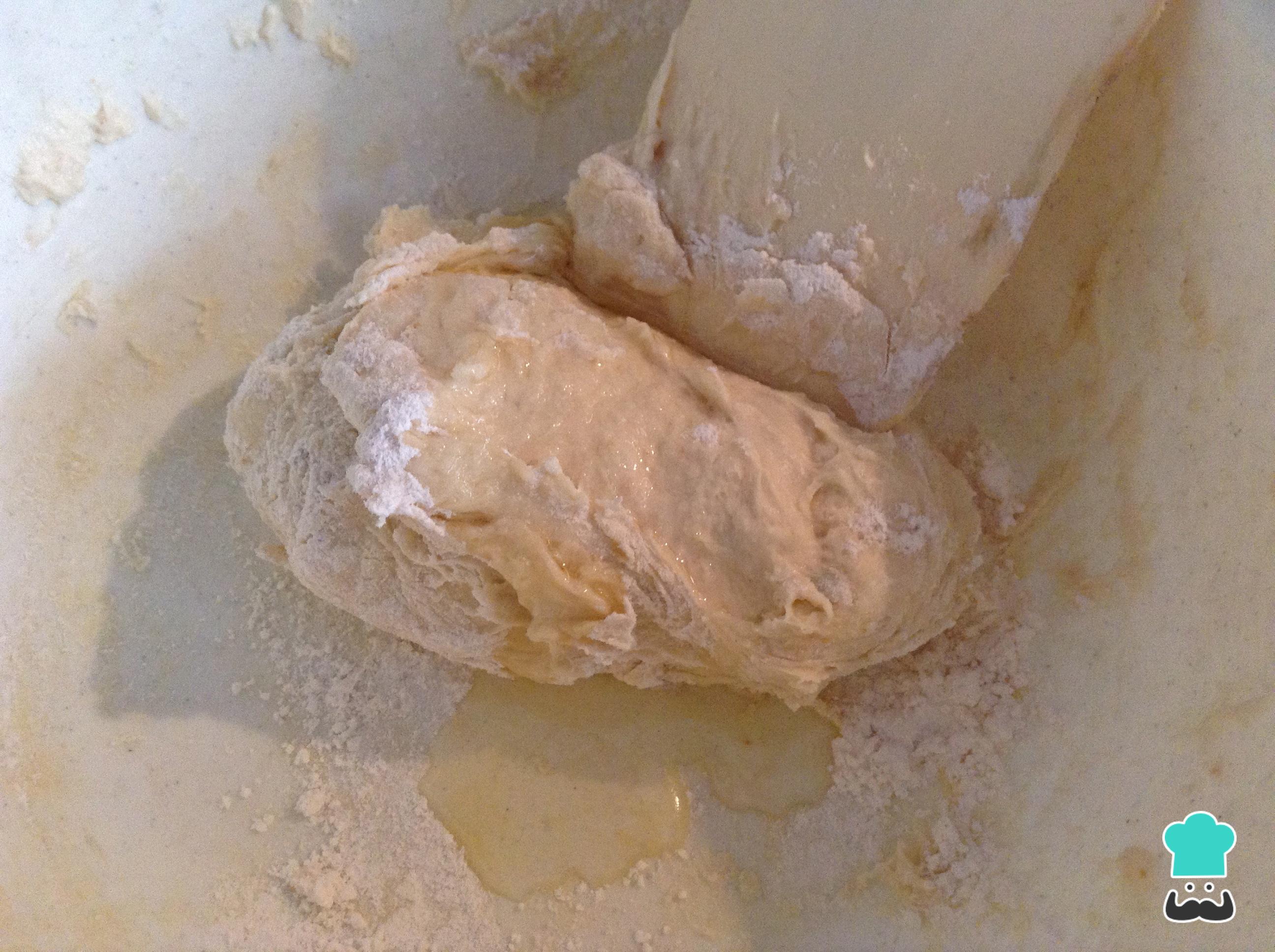 Acrescente o azeite de oliva e misture muito bem, desta vez com as mãos, por 5 minutos ou até obter uma massa lisa e compacta.