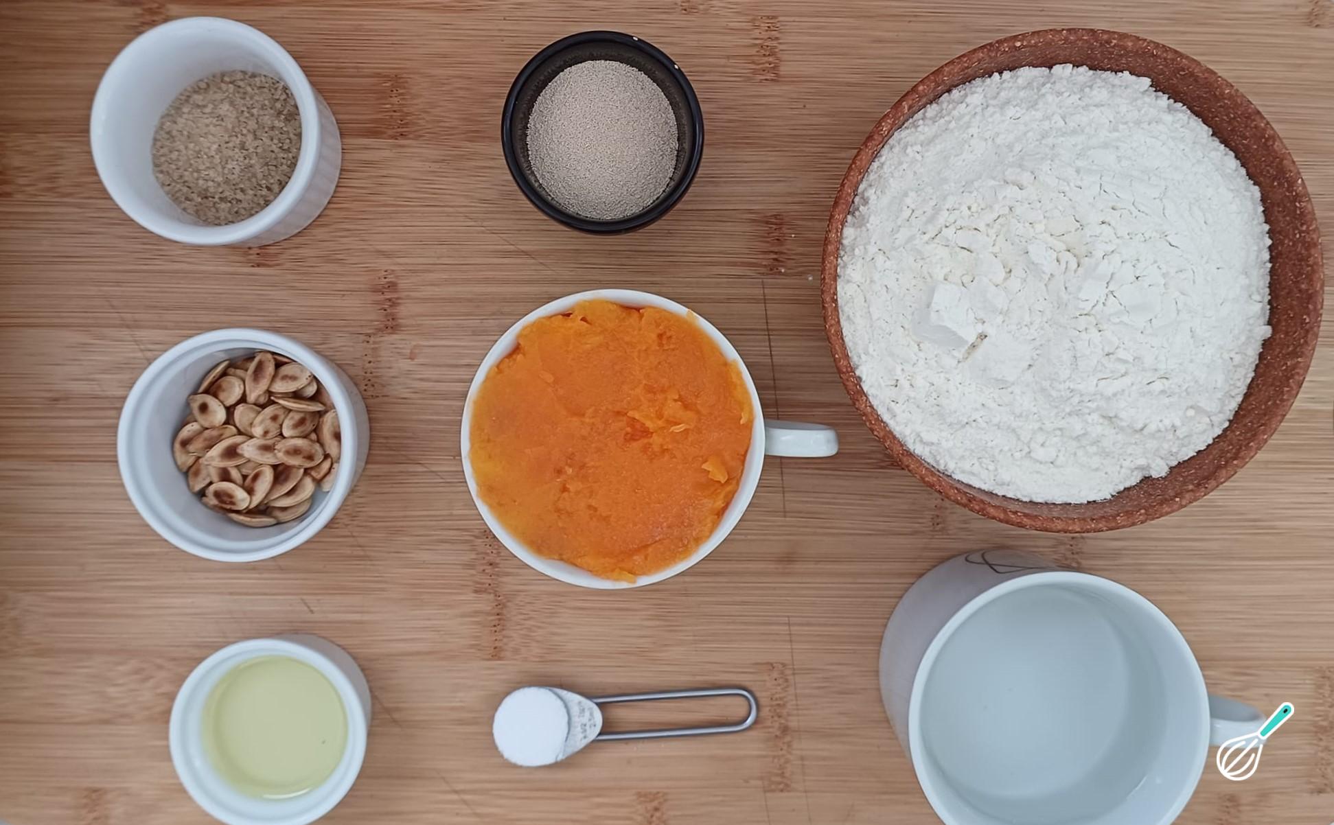 Separe os ingredientes necessários para preparar a receita de pão de abóbora.