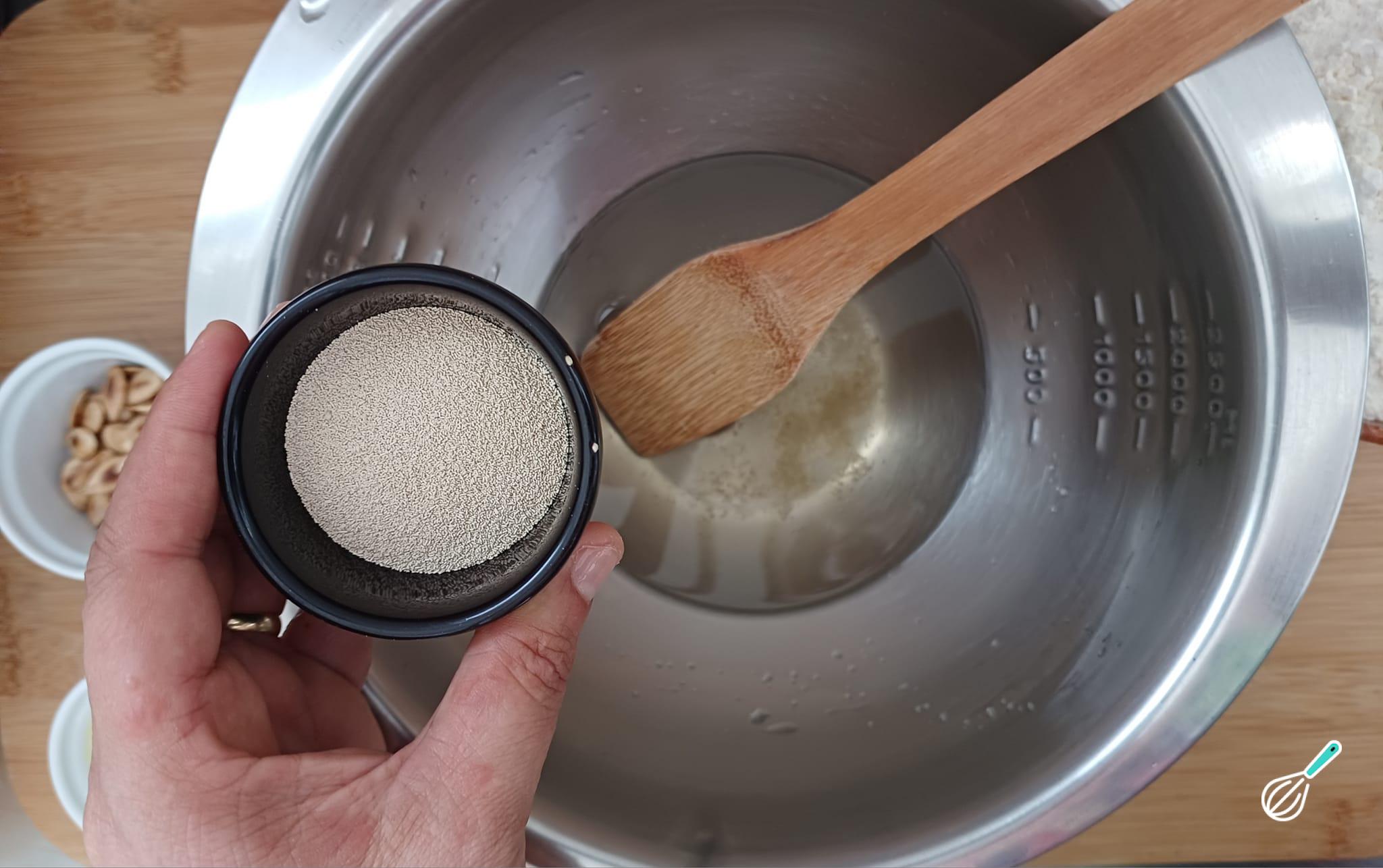 Num bowl, adicione a água morna, o açúcar e o fermento biológico seco, misture delicadamente.