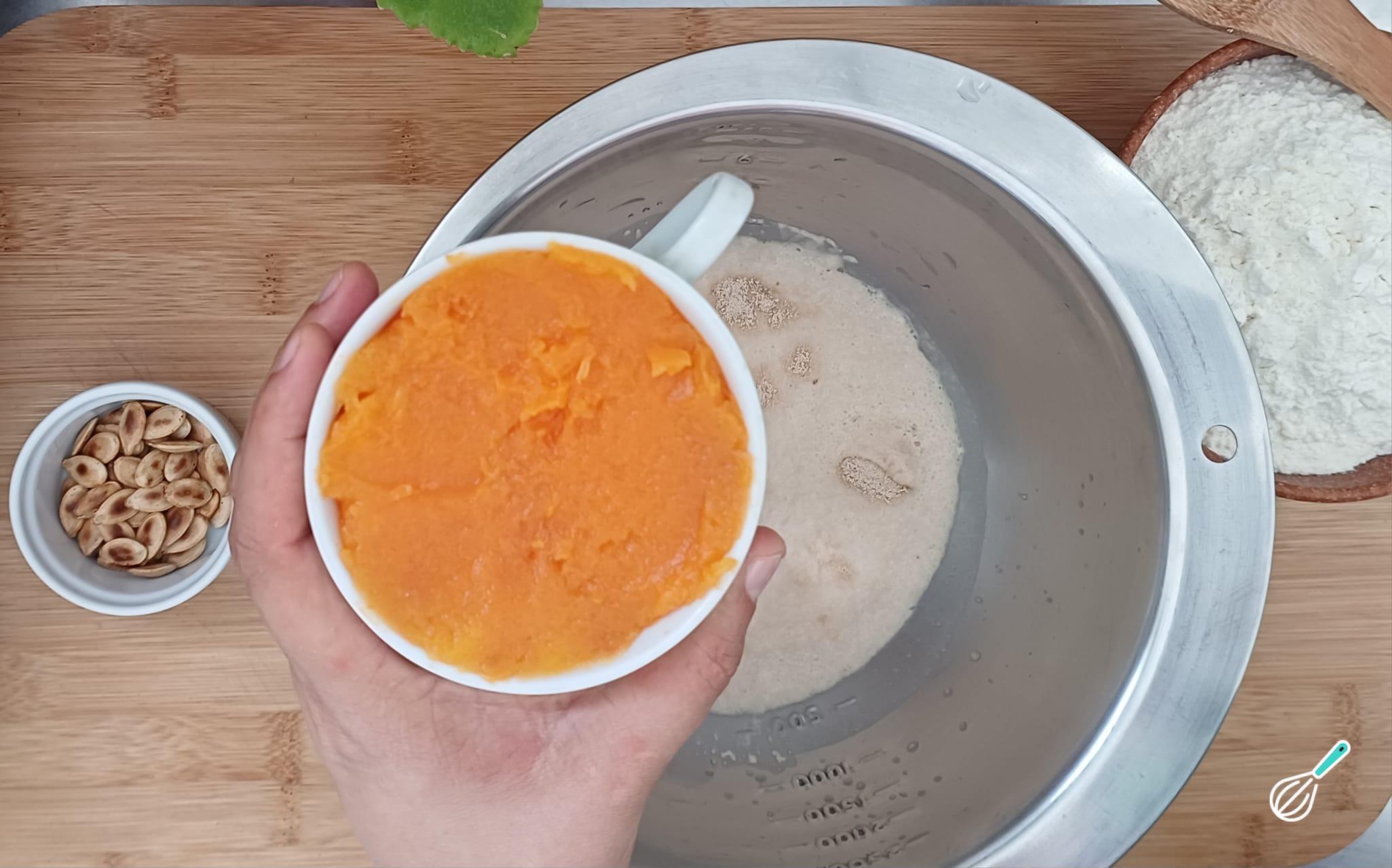 Após esse tempo, junte a abóbora cozida e amassada, o óleo e o sal, misturando bem.