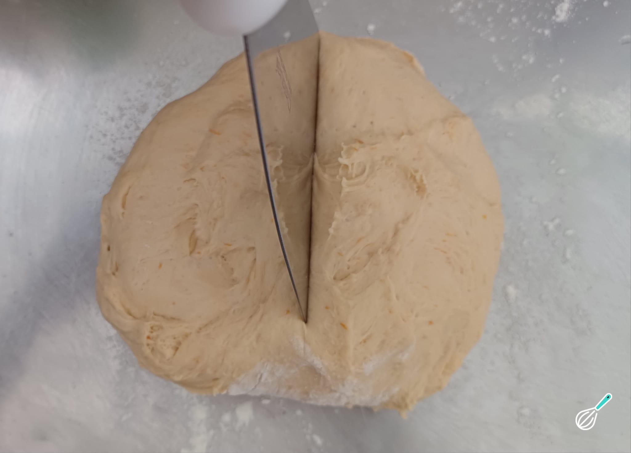 Após a massa crescer, retire-a da vasilha e transfira-a para uma superfície lisa e enfarinhada e divida-a em 2 partes.
