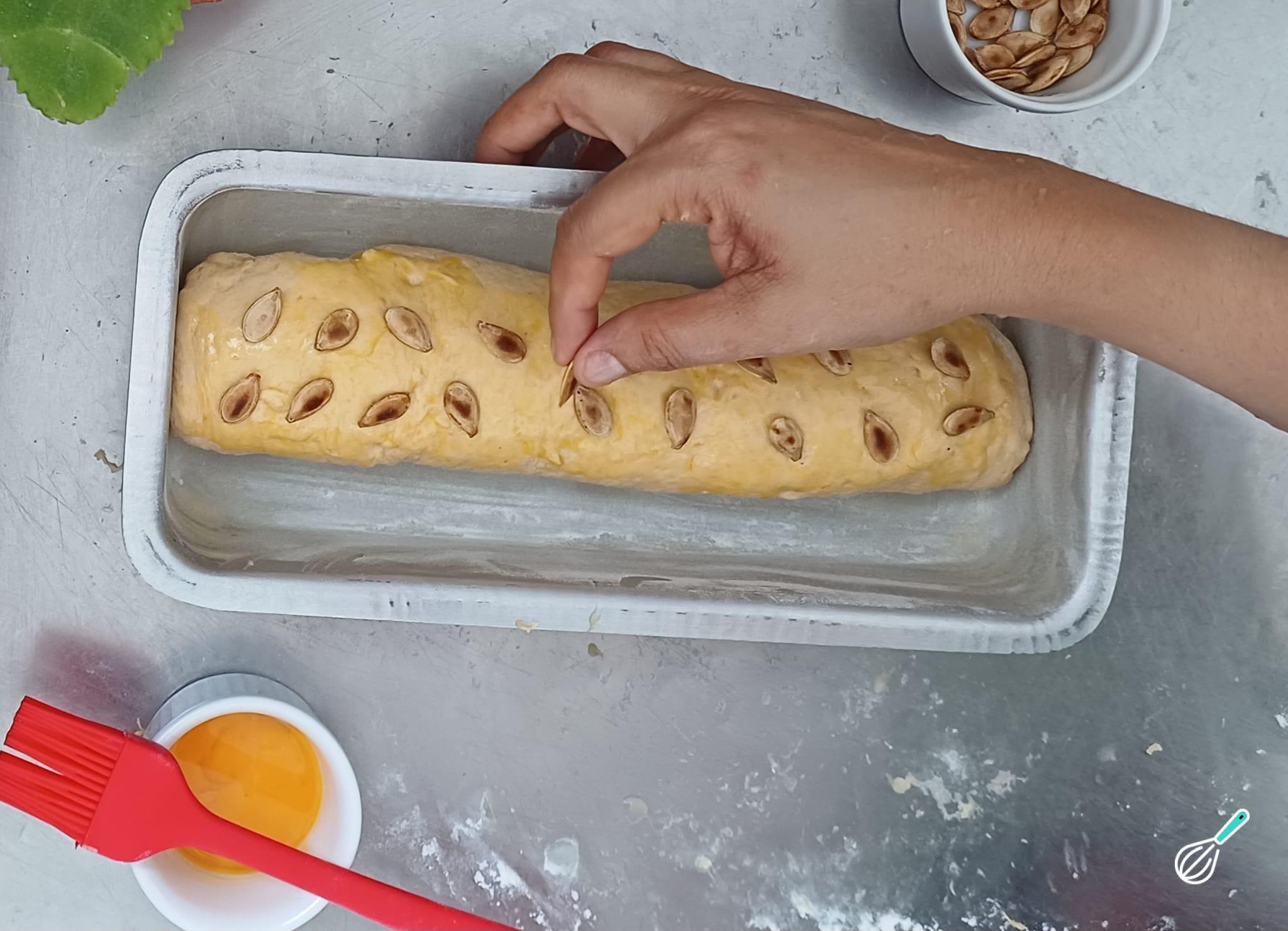 Acomode a massa numa forma untada e enfarinhada, pincele com gema e decore com sementes de abóbora tostadas.