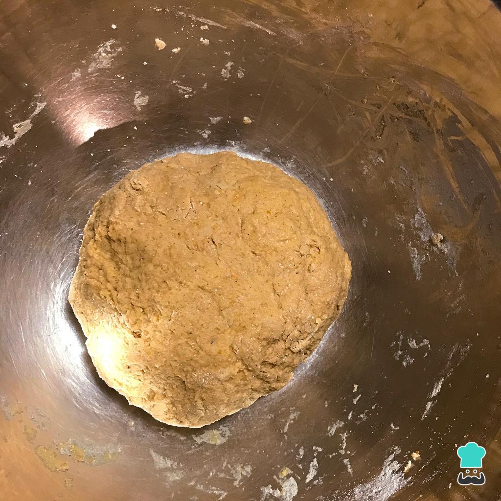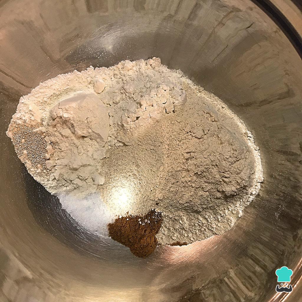 Comece misturando os secos (a farinha de trigo, a farinha de trigo integral, o fermento biológico, o sal e o pumpkin spice).
