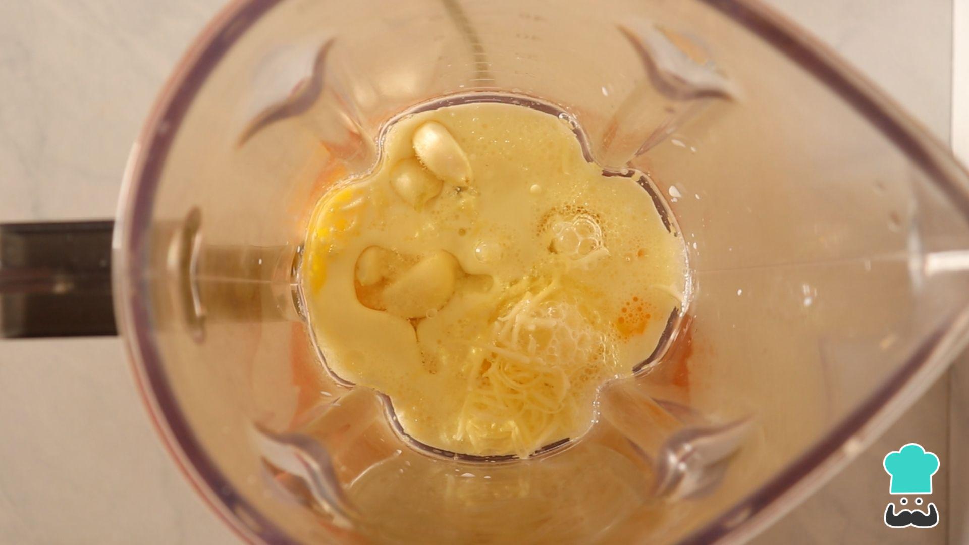 Coloque o queijo, o açúcar, o sal, os ovos, os dentes de alho, o leite e o óleo no liquidificador e bata bem.