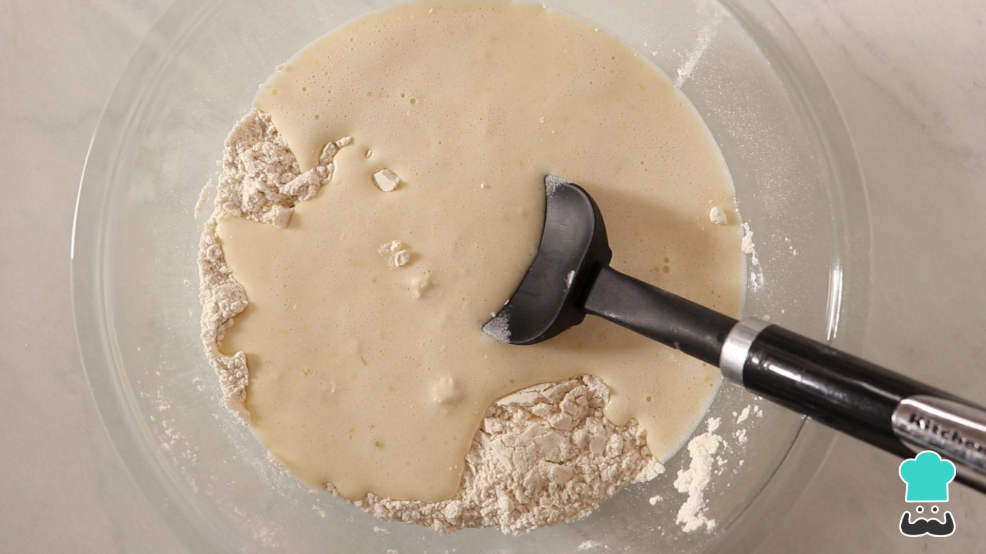 E em seguida adicione a mistura batida no liquidificador. Misture bem, até a massa ficar uniforme. A textura é parecida com uma massa de bolo.