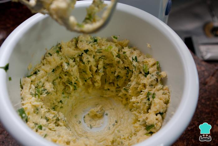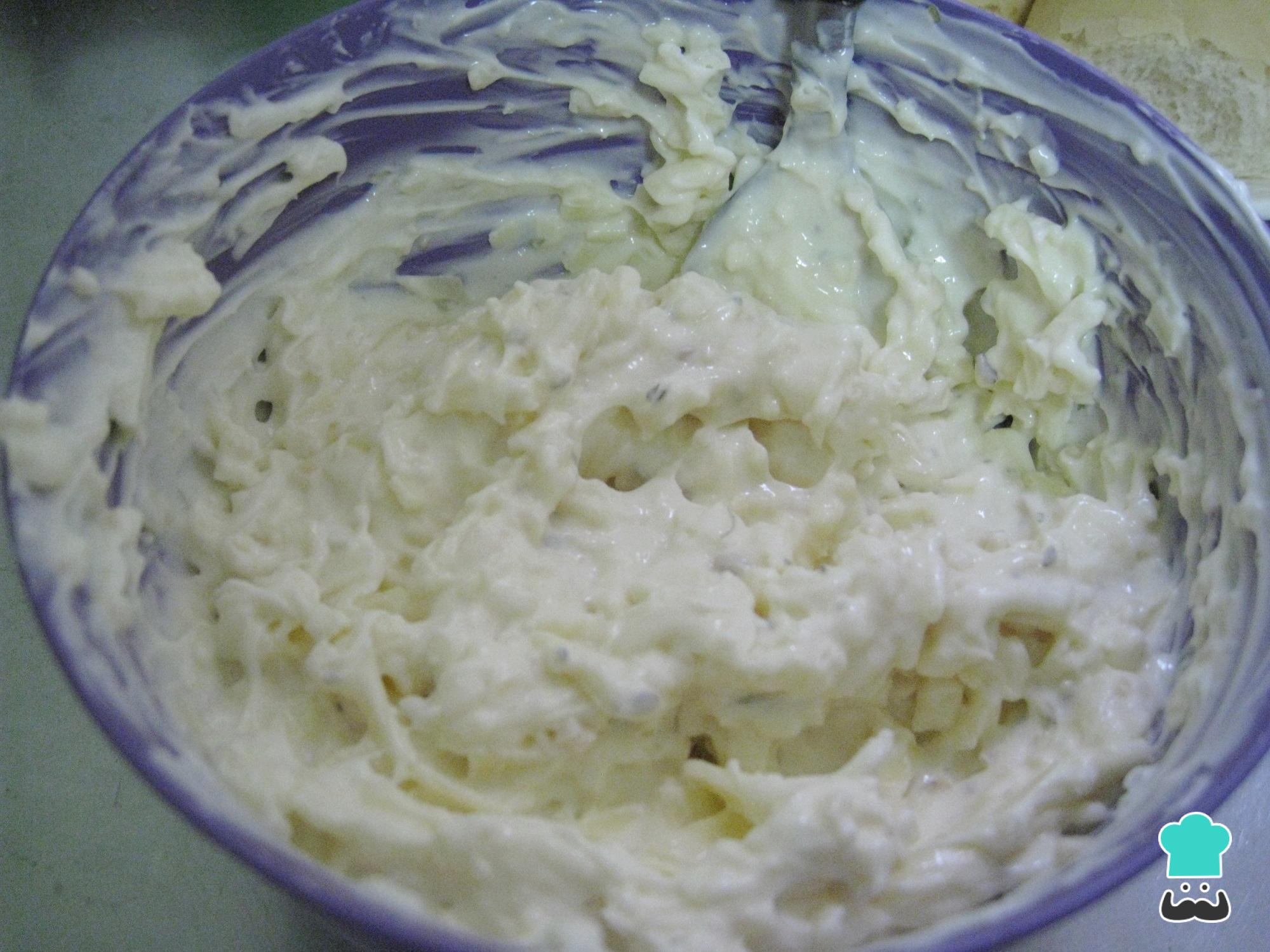 Acrescente o azeite de oliva, a manteiga e o sal e bata muito bem até obter uma pasta mole. Se ficar muito espesso, acrescente um pouco mais de azeite.