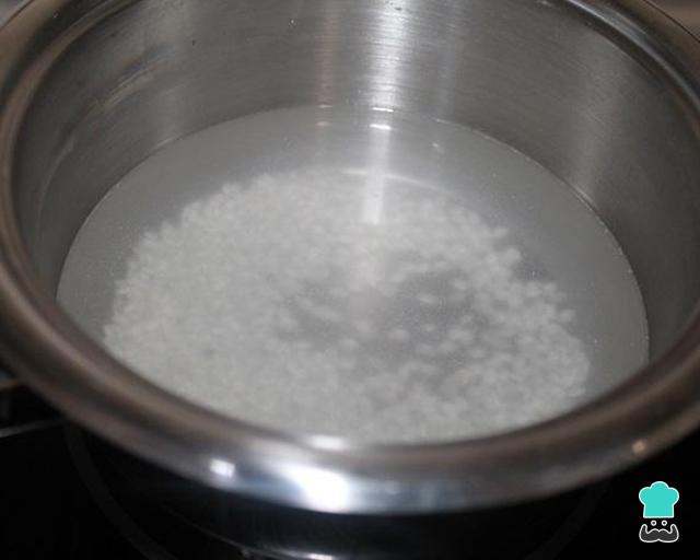 Se você estiver usando arroz cru para esta receita de pão de arroz, comece por cozinhar o arroz. Para isso leve ao fogo uma panela com o arroz, água e uma pitada de sal e cozinhe por 15 minutos, para que fique bem macio.