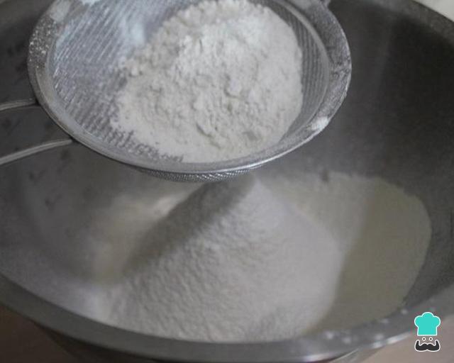 Continue preparando esta receita de pão vegano: peneire a farinha de trigo para uma tigela, para que fique nem fina e resulte num pão suave.