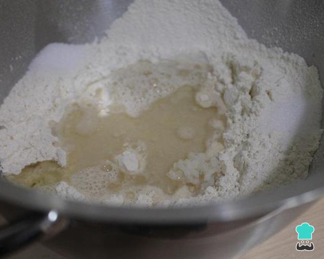 Desfaça o fermento na água morna e, se necessário, reserve por uns minutinhos para que se dissolva mais facilmente.
