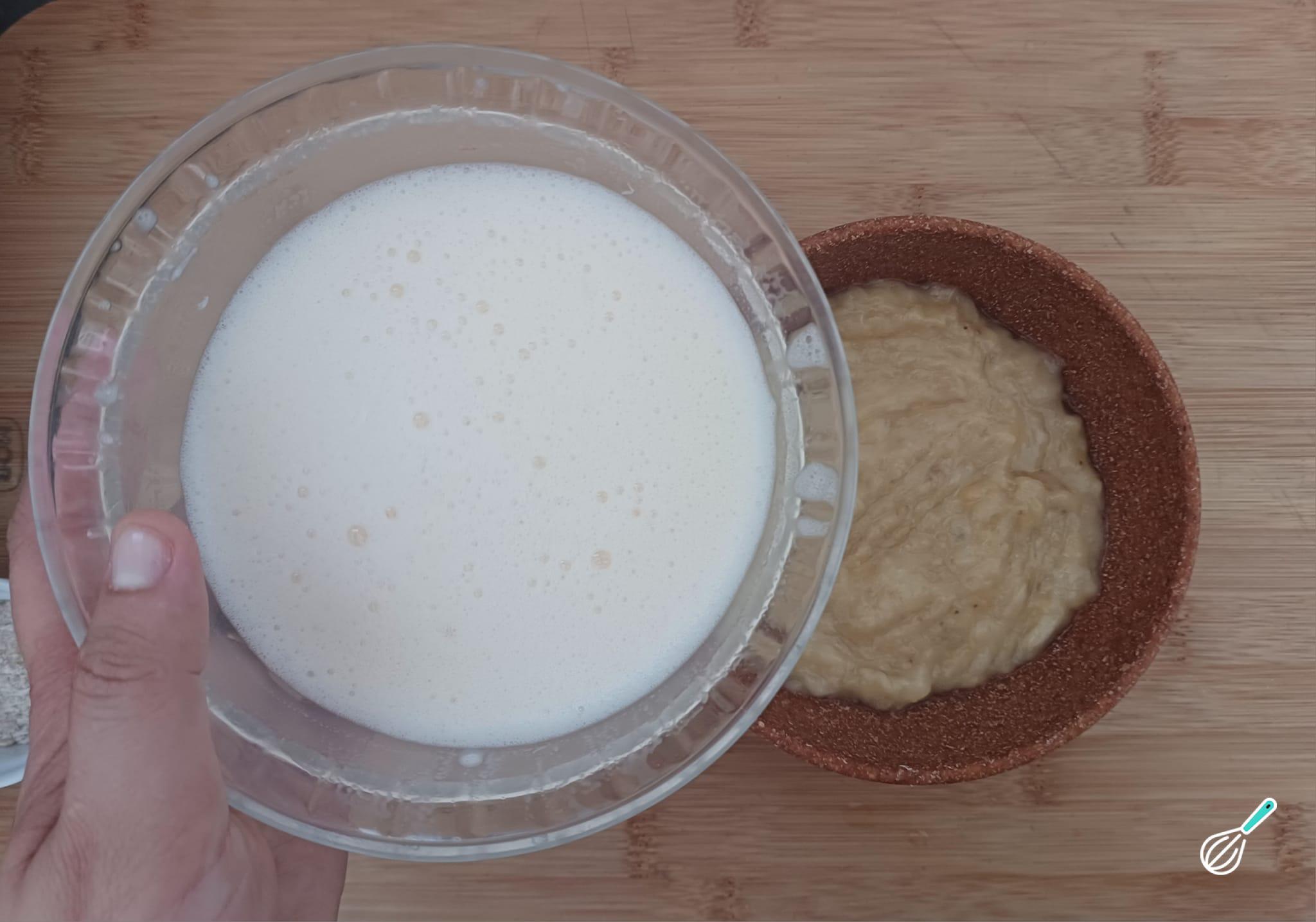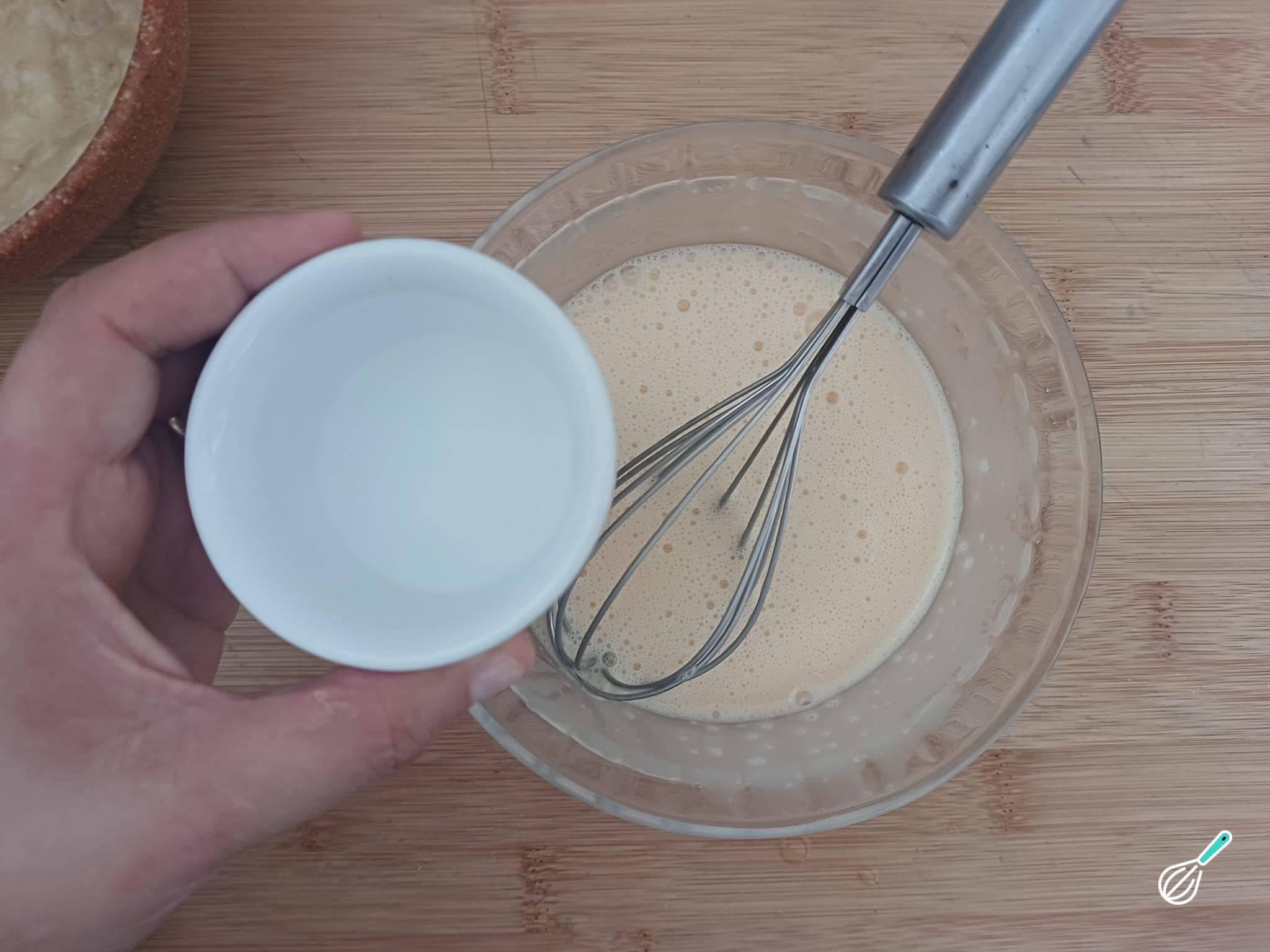 Num bowl, bata o ovo e adicione a água e o óleo, misturando bem.