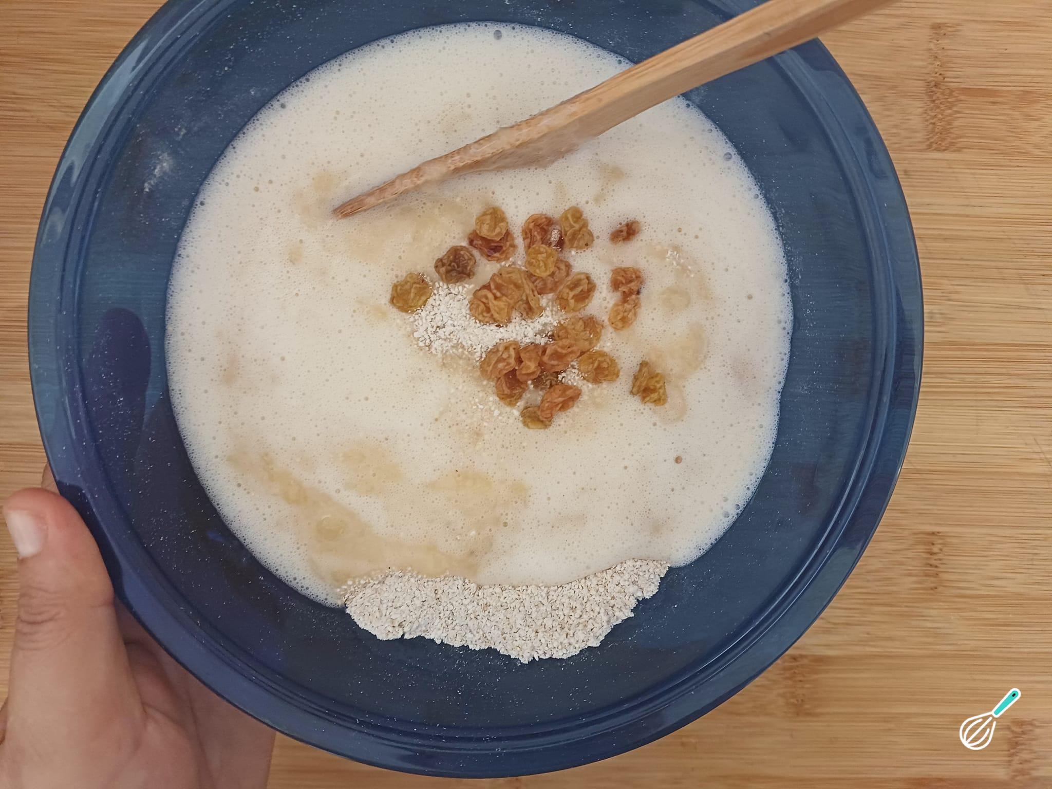 Amasse as bananas com o auxílio de um garfo. Se quiser, substitua as uvas passas por mix de nuts.