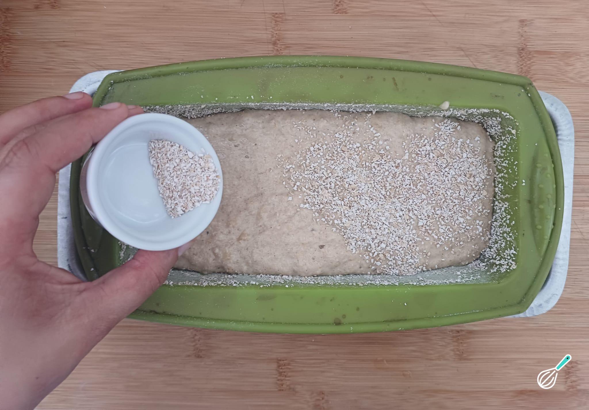 Transfira a massa para uma forma inglesa pequena, untada com óleo e polvilhada com farinha de aveia.