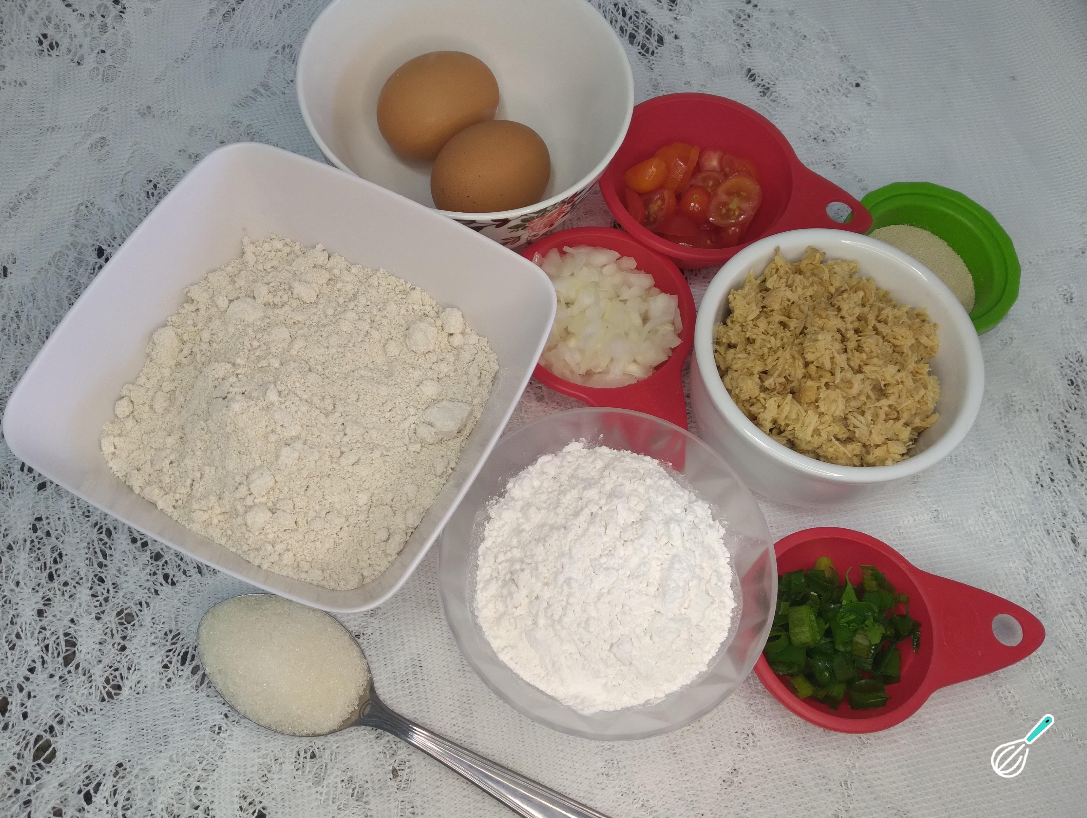 Comece separando os ingredientes da massa do pão e do recheio do pão. Meça tudo bem certinho para não errar as proporções de farinhas. Corte a cebola em cubinhos pequenos e a cebolinha verde em rodelinhas fininhas. Separe os temperos. Deixe tudo organizado.