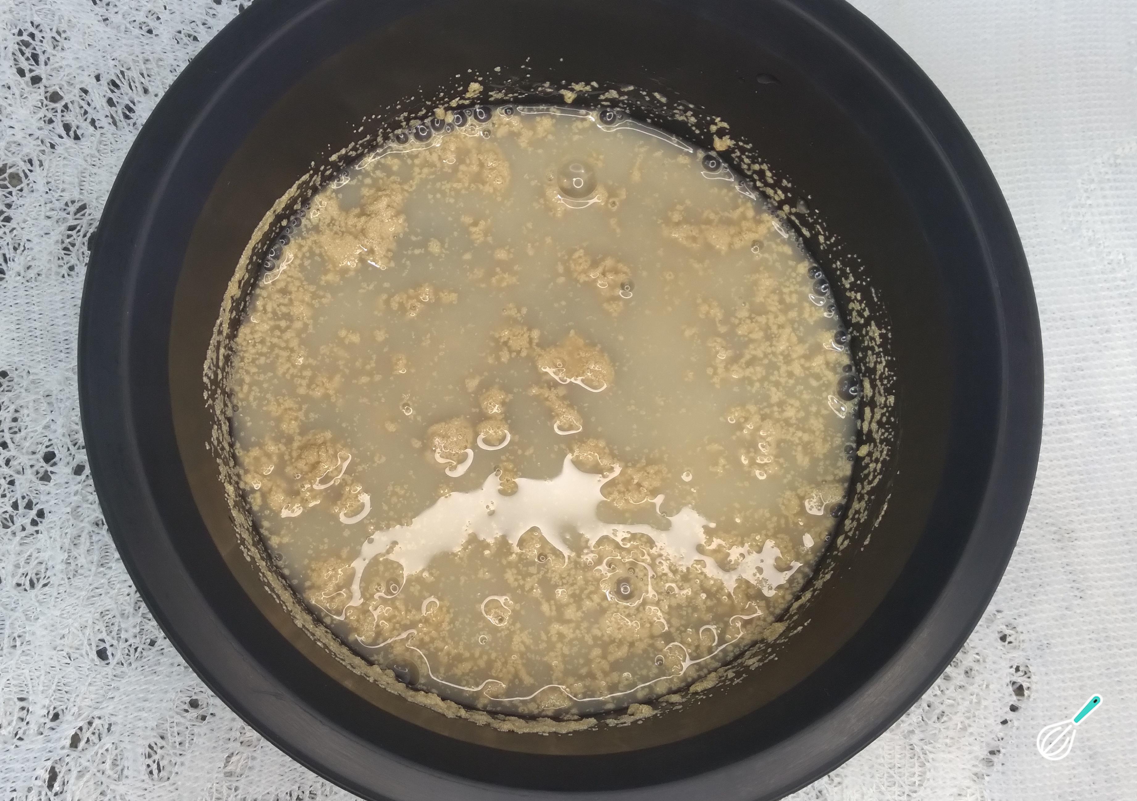 Em uma tigela, coloque o fermento biológico seco, o açúcar e 0.4 xicara de água. Mexa e cubra. Coloque a tigela em lugar abafado e fechado. Pode ser o micro-ondas ou o forno. Deixe descansar por 20 minutos.