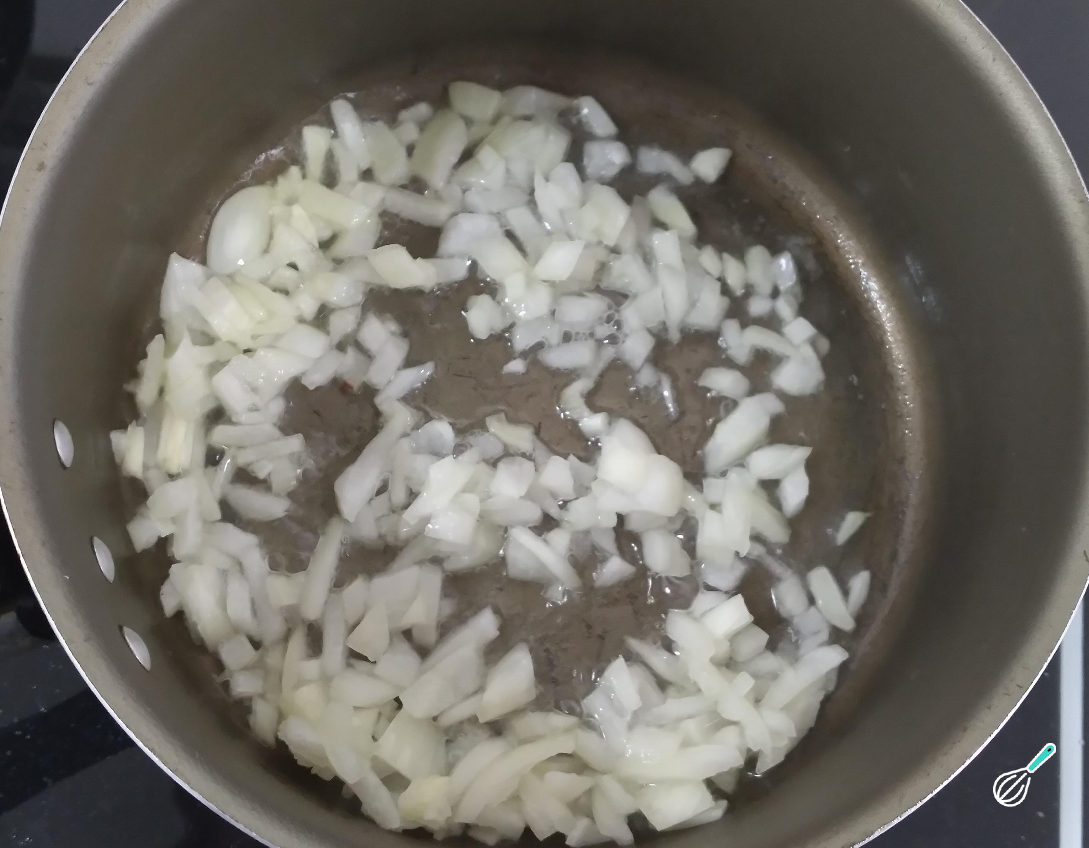 Enquanto o fermento descansa, prepare o recheio do pão. Em uma panela, coloque o óleo e a cebola branca picada. Refogue e deixe que ela solte líquido.
