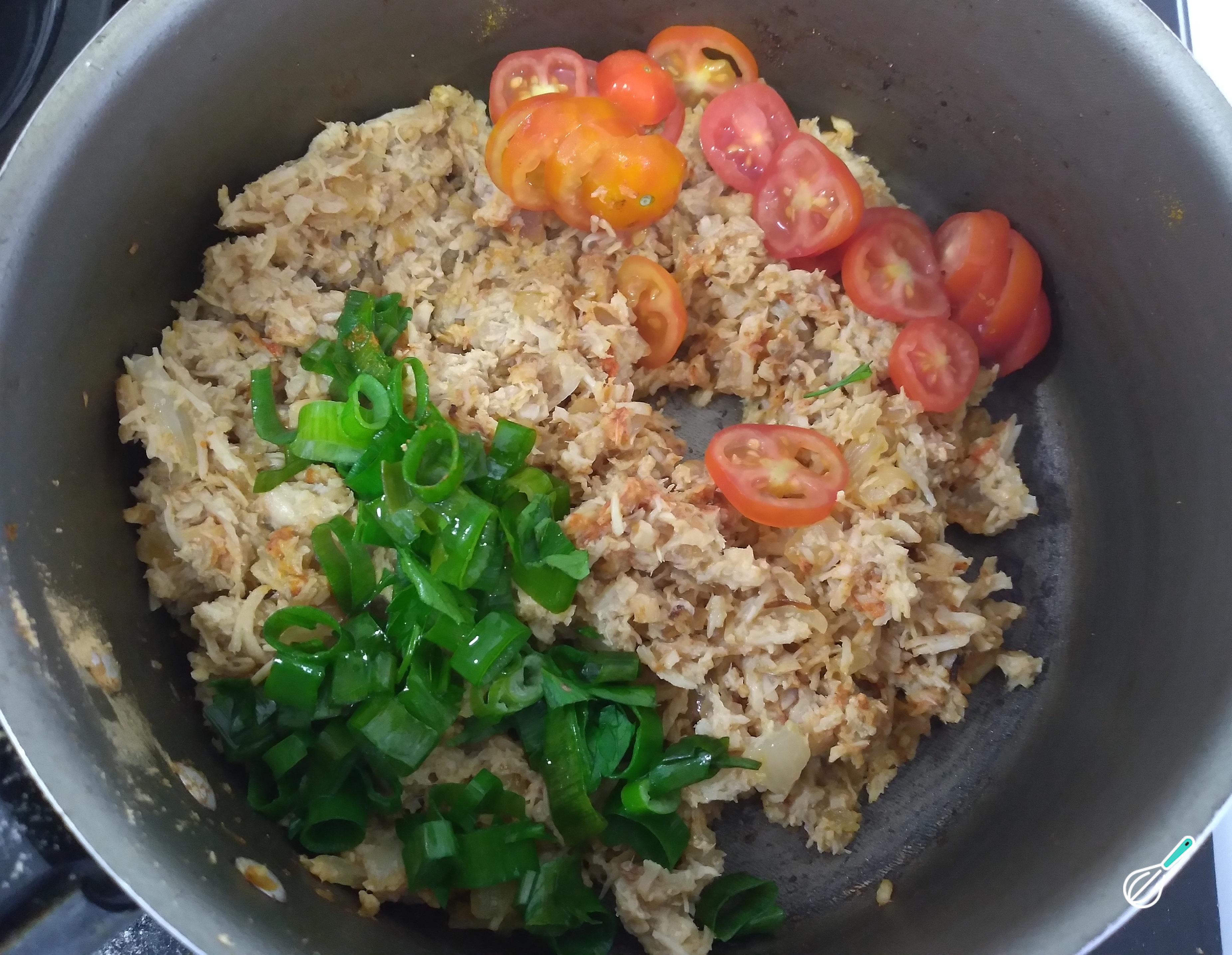Feito isso, acrescente o frango desfiado e os temperos de sua preferência. Mexa para incorporar os sabores. Em seguida, acrescente o restante dos ingredientes do recheio. Mexa bem e desligue o fogo. Reserve o recheio.