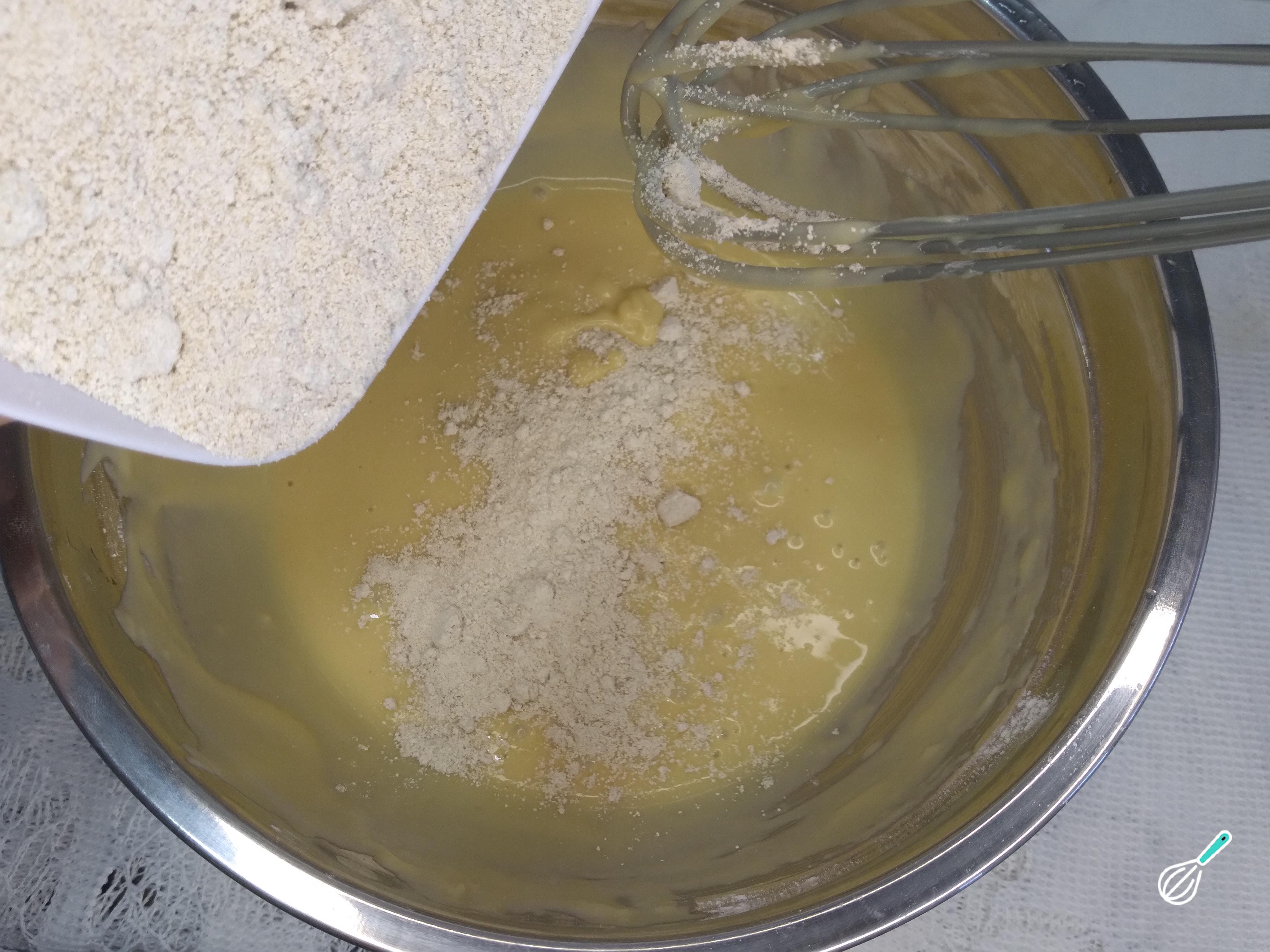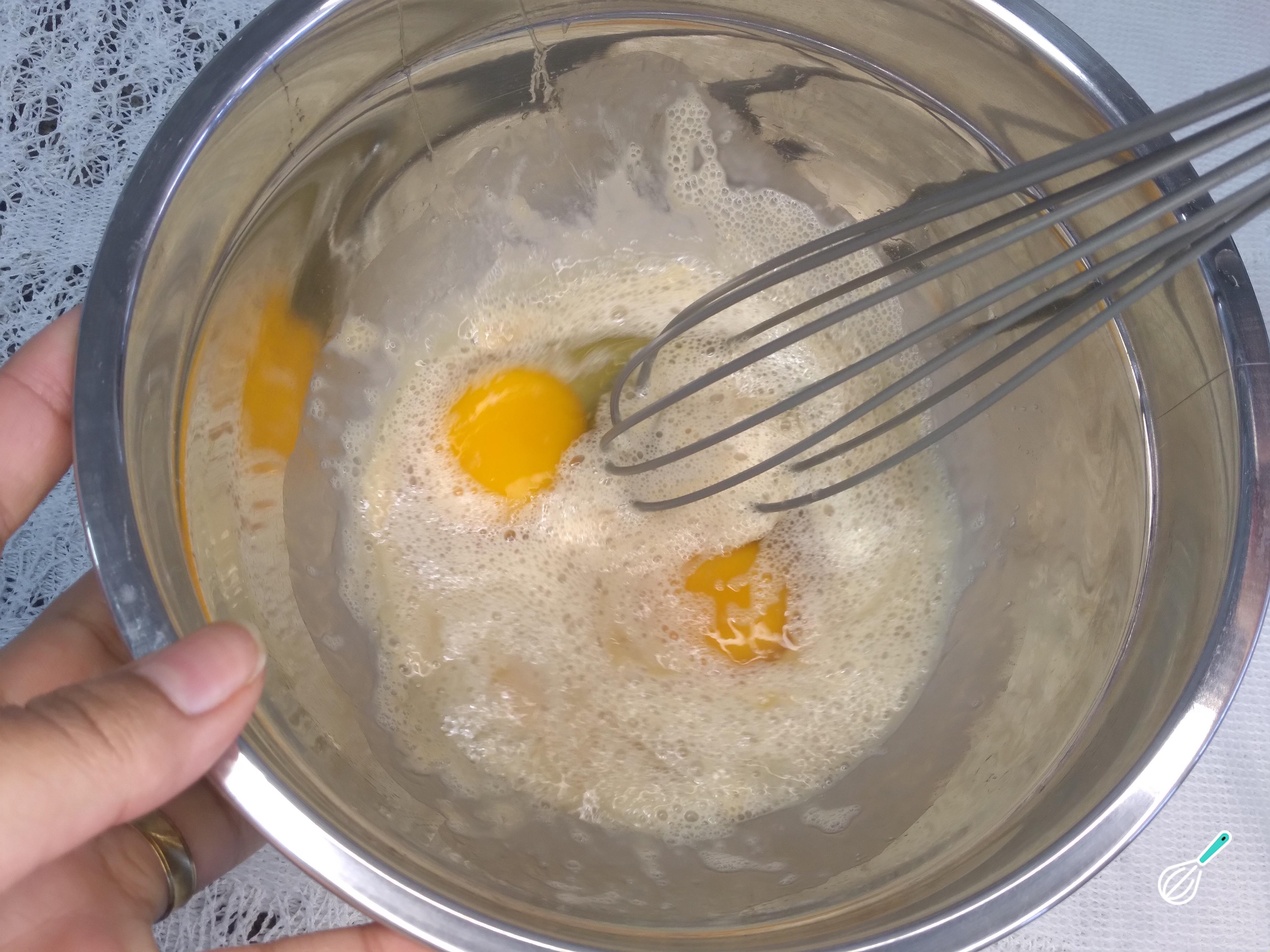 Depois do descanso de 20 minutos, coloque o fermento em um bowl e acrescente o azeite e os ovos. Mexa bem com um fouet.