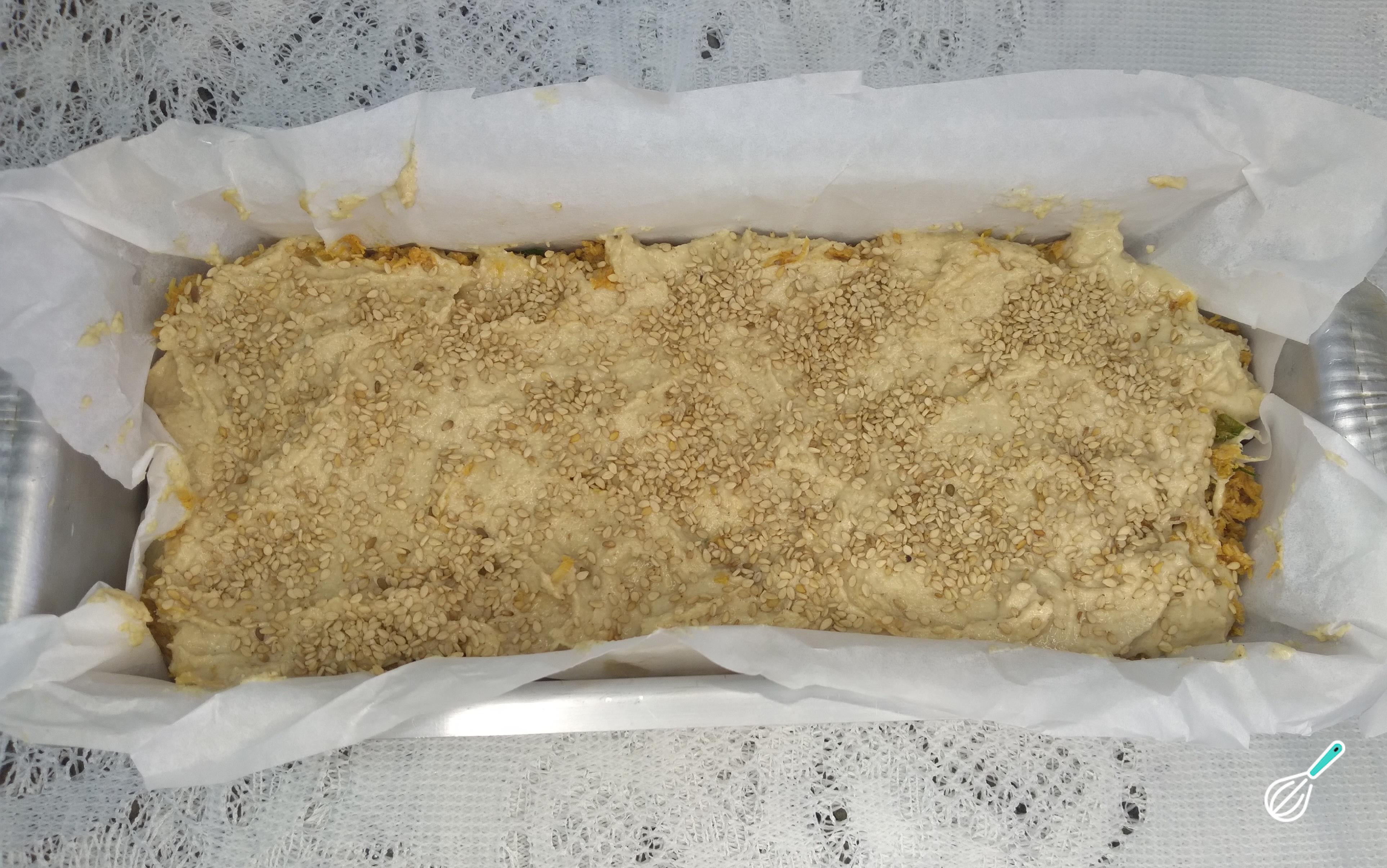 Depois do descanso da massa, forre uma forma de pão com papel manteiga, assim ficará mais fácil para desenformar. Coloque uma parte da massa, o recheio e depois cubra com a outra parte da massa. Decore com gergelim. Pré-aqueça o forno a 200 graus e leve para assar por aproximadamente 35 a 40 minutos.
