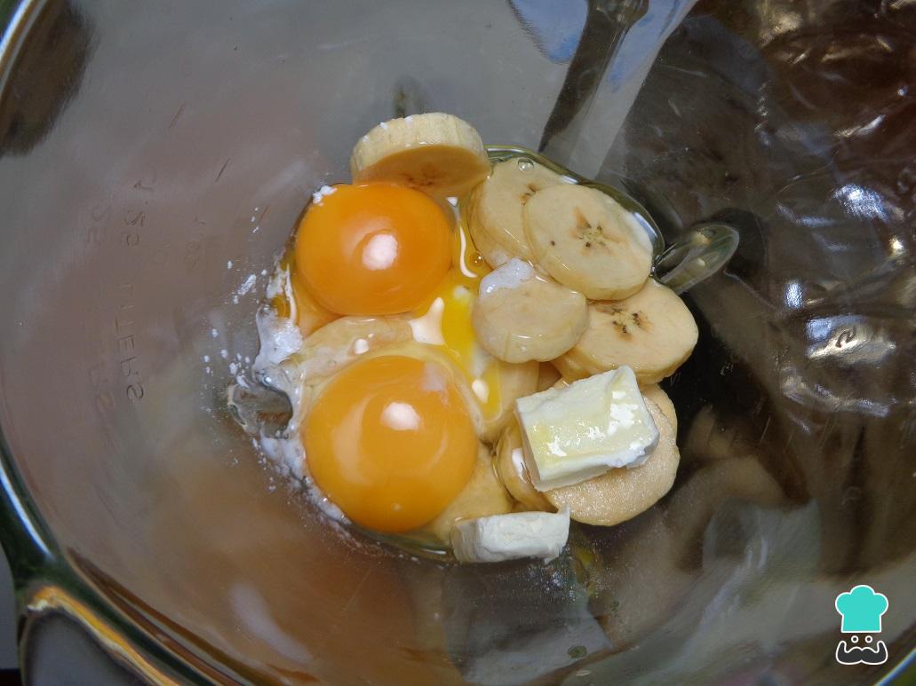 Coloque no liquidificador a banana, os ovos, a manteiga ou margarina e o fermento. Bata até obter uma homogênea e cremosa.