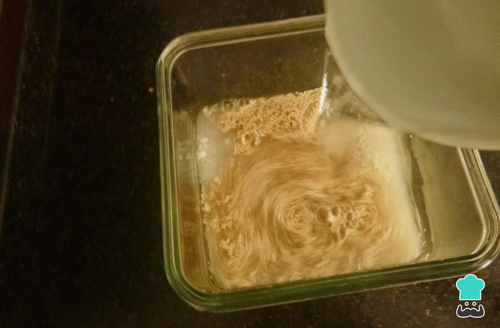 Para preparar esta receita de pão de batata doce comece por dissolver o tablete de fermento na água.