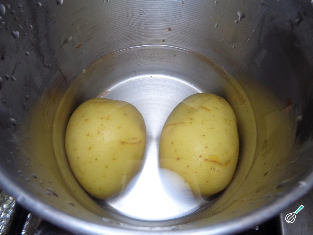 Em seguida cozinhe as batatas: coloque-as em uma panela com água suficiente e deixe cozer até que estejam muito suaves. Uma vez prontas as batatas, retire a casca e esmague em purê.