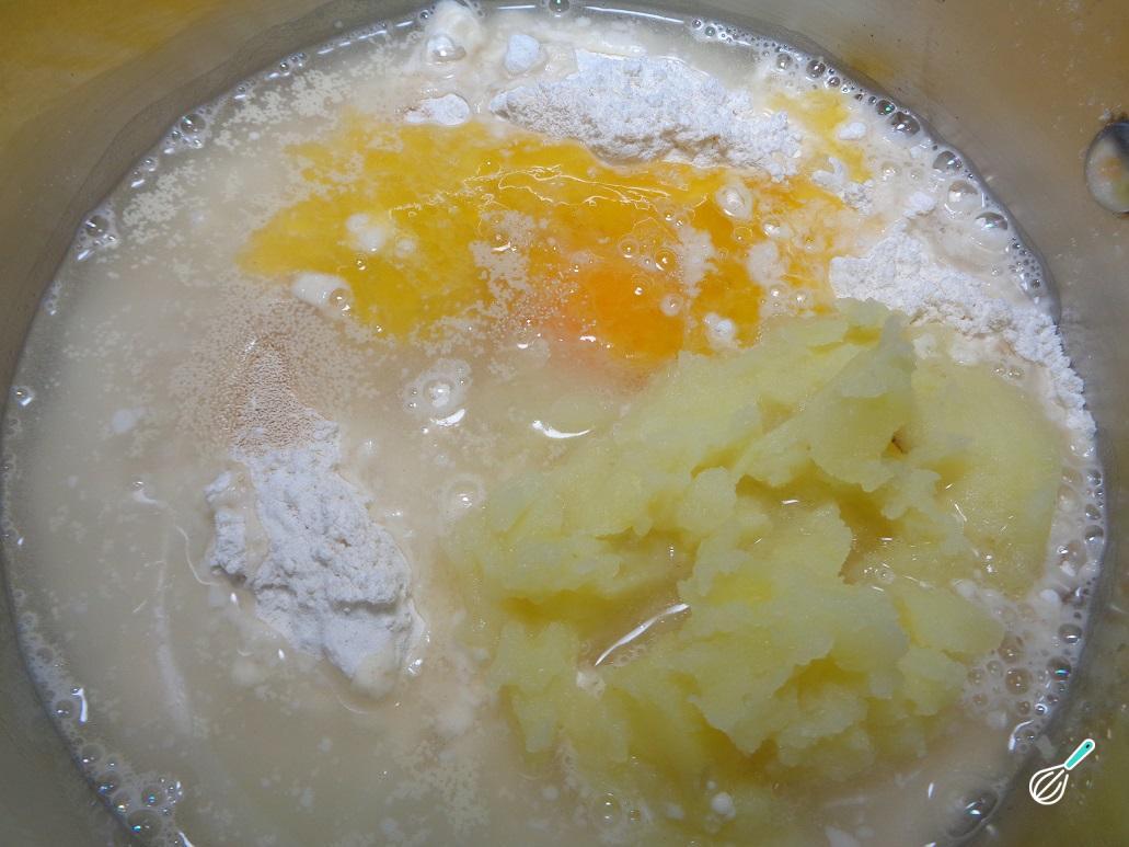 Em uma tigela funda coloque todos os ingredientes: a farinha sem glúten, o purê de batata, o fermento, o ovo, a água morna e a margarina amolecida. Misture muito bem até obter uma massa homogênea.