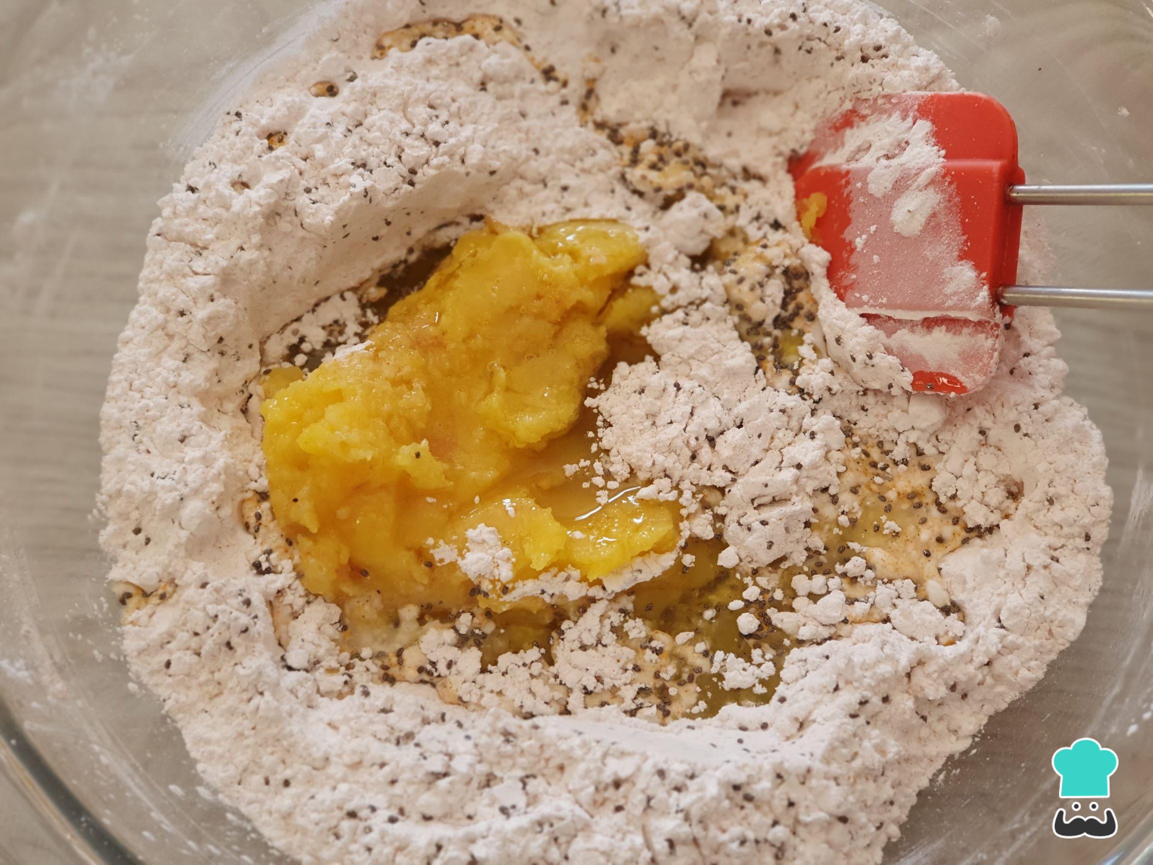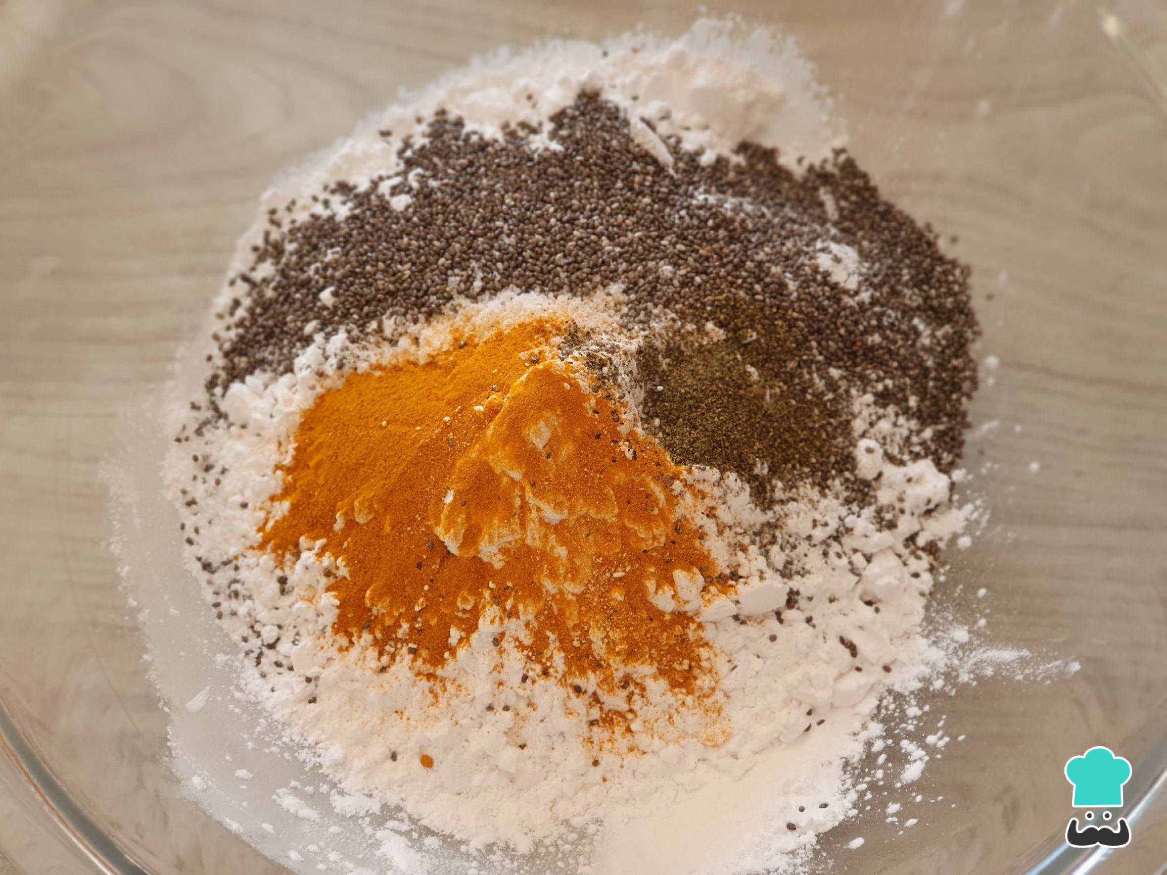 Comece misturando todos os ingredientes secos em uma tigela: os polvilhos, as sementes de chia, o açafrão, o sal e o tempero lemon pepper.
