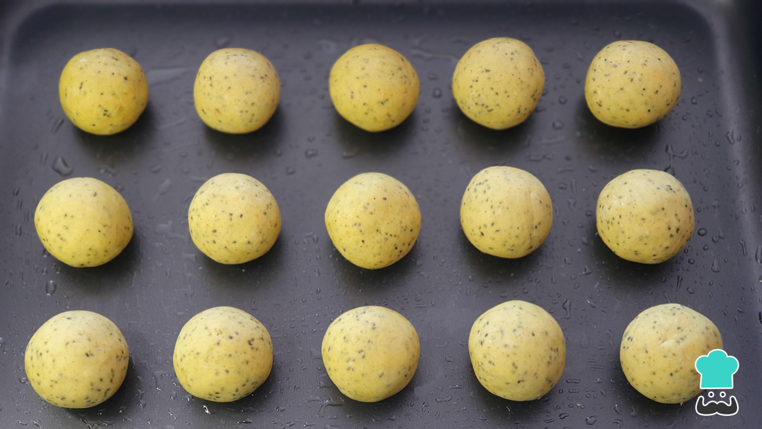Faça bolinhas com a massa e acomode-as em uma assadeira untada com azeite. Asse em forno preaquecido 200 graus por aproximadamente 30 minutos.