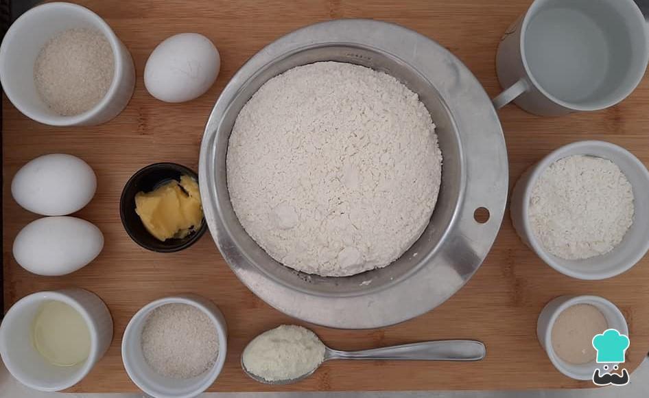 Separe os ingredientes necessários para preparar a receita de pão de cachorro quente.