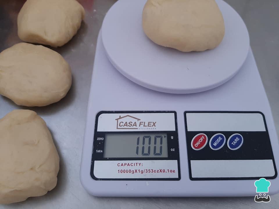 Divida cada parte em 4 ou 5 porções, pesando cada uma entre 80 a 100 gramas de massa, dependendo do tamanho do pão que você deseja servir com o cachorro quente.