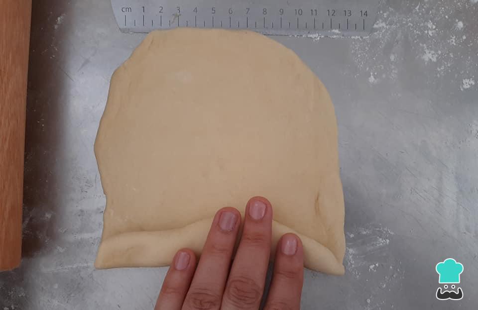 Numa bancada enfarinhada, abra cada porção formando um retângulo com medidas aproximadas de 11cm x 18cm.