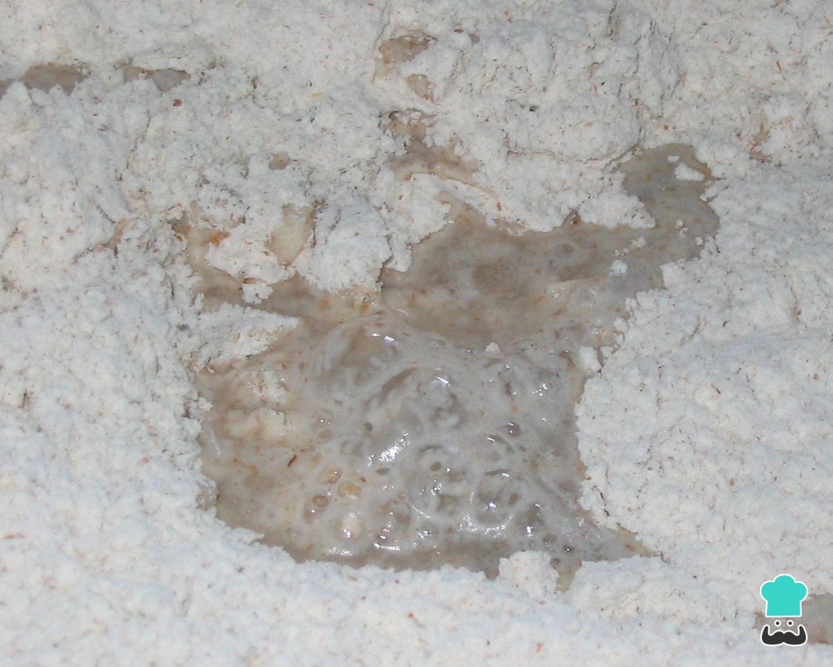 Numa bacia grande ou numa bancada coloque as duas farinhas misturadas com o sal. Abra um buraco ao centro e coloque aí a água com o fermento e o azeite. Pouco a pouco comece misturando as farinhas com os líquidos, começando pelas beiradas.