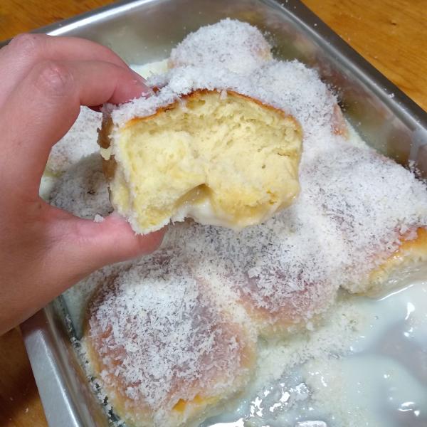 Assim que os pães estiverem prontos, retire do forno e despeje o creme de coco + leite condensado.
