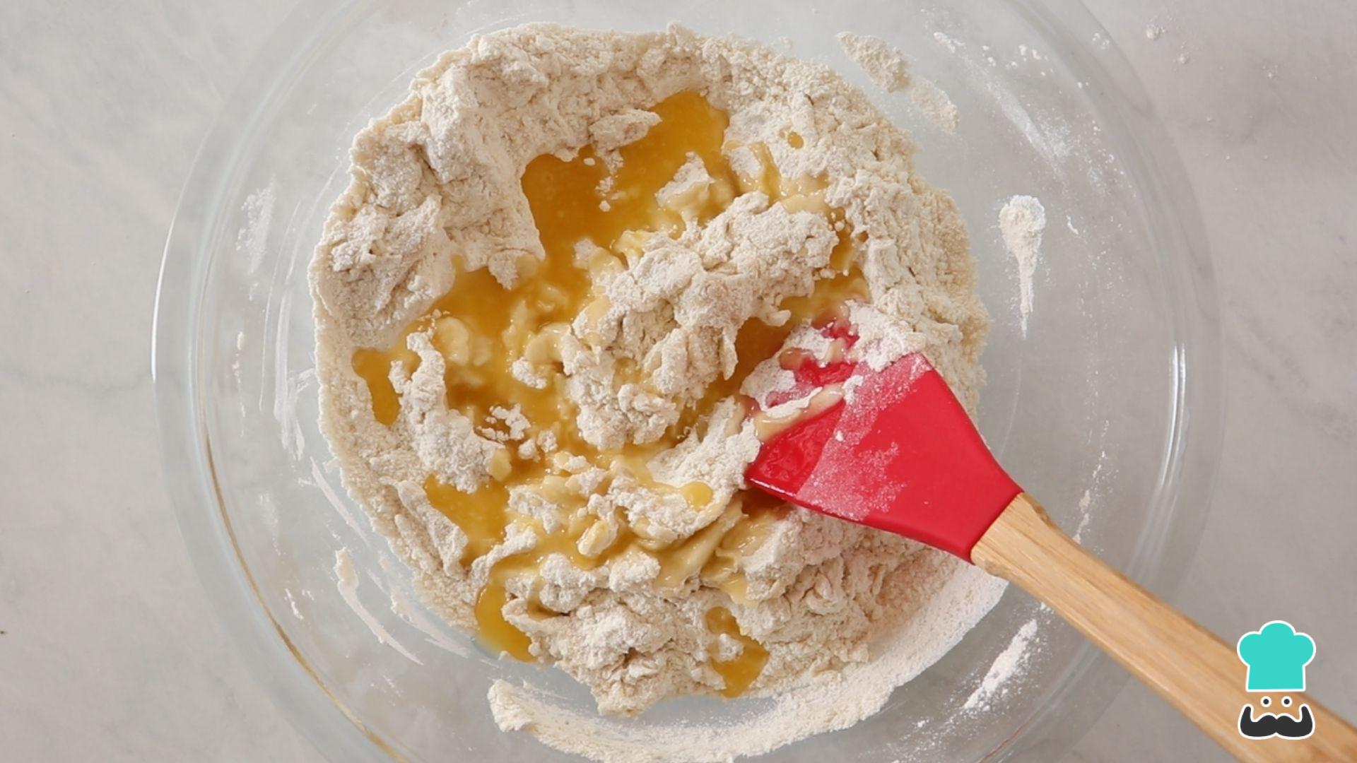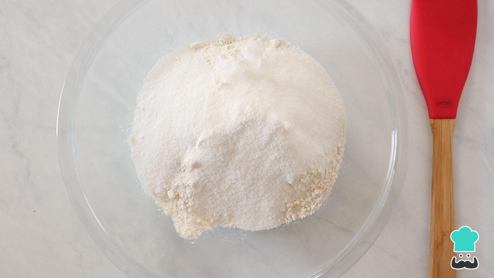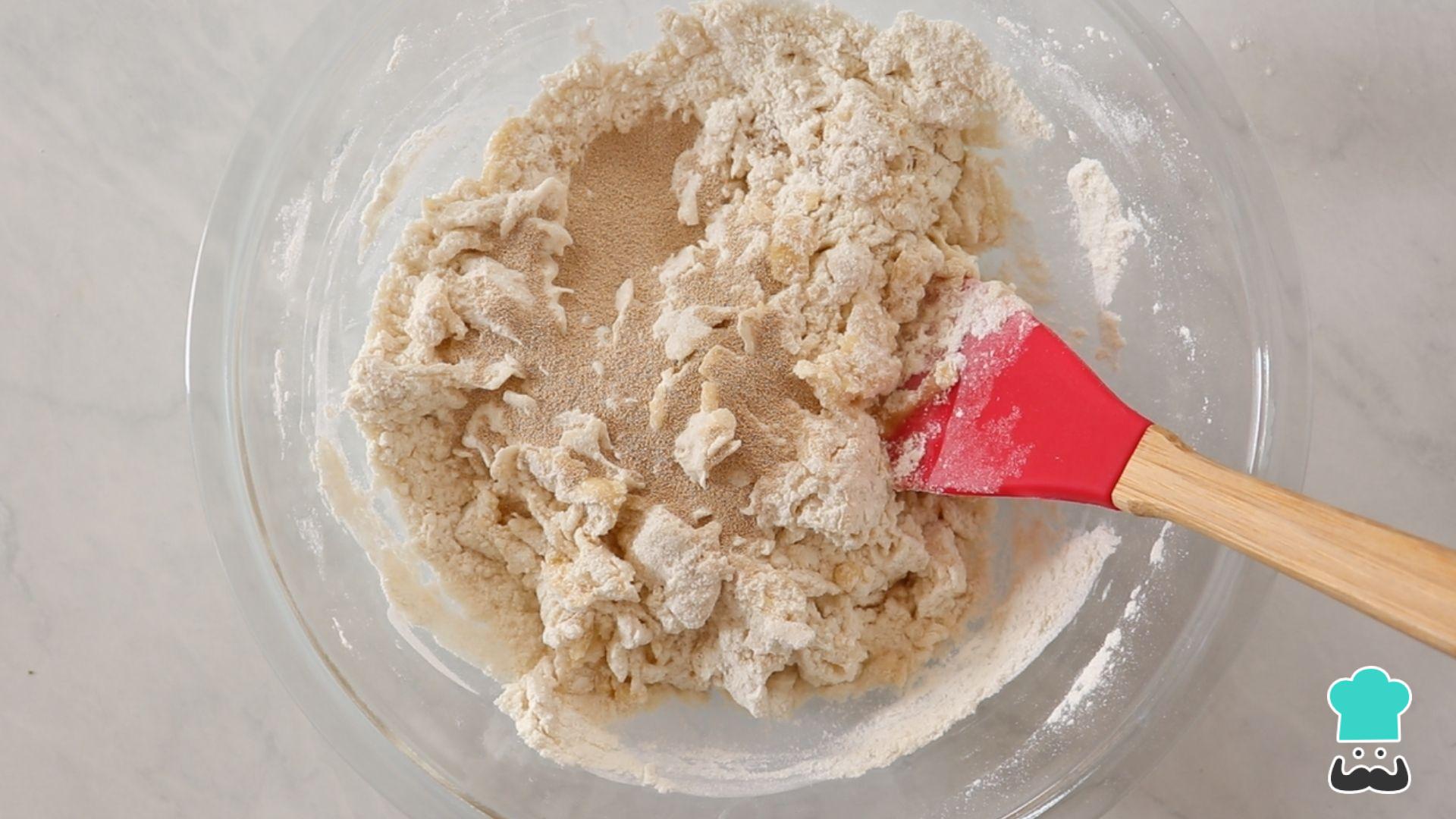 Comece misturando muito bem em uma tigela grande a farinha, o açúcar e o sal. Em seguida acrescente metade da água e continue misture mais uma vez.