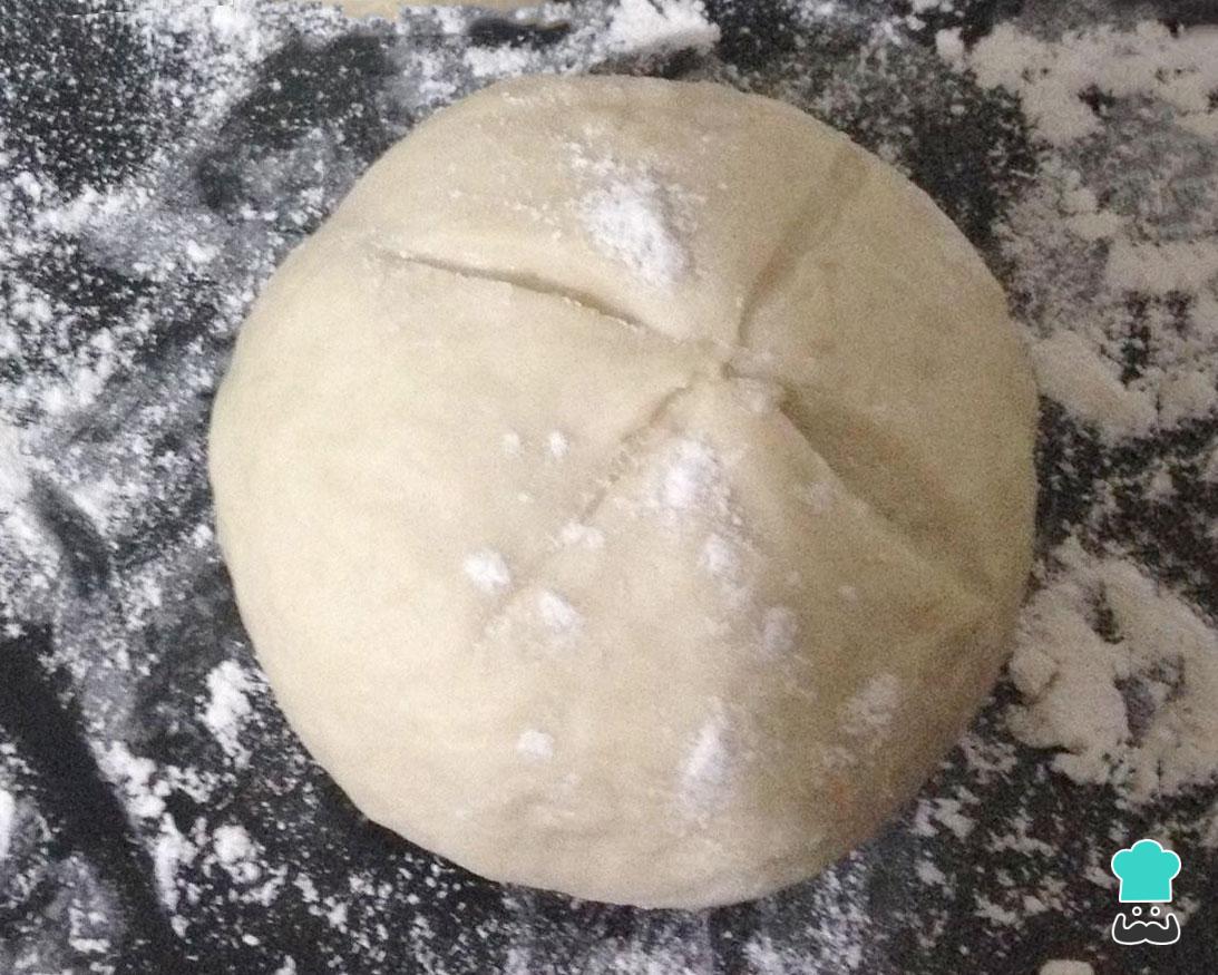 Depois desse tempo retire a massa da geladeira e espere que tome a temperatura ambiente. Preaqueça o forno na temperatura máxima (250ºC) com calor apenas em baixo e ventilação ligada. Coloque o pão em um tabuleiro de forno com papel manteiga e, com uma faca afiada, faça um corte em forma de cruz, como na foto.