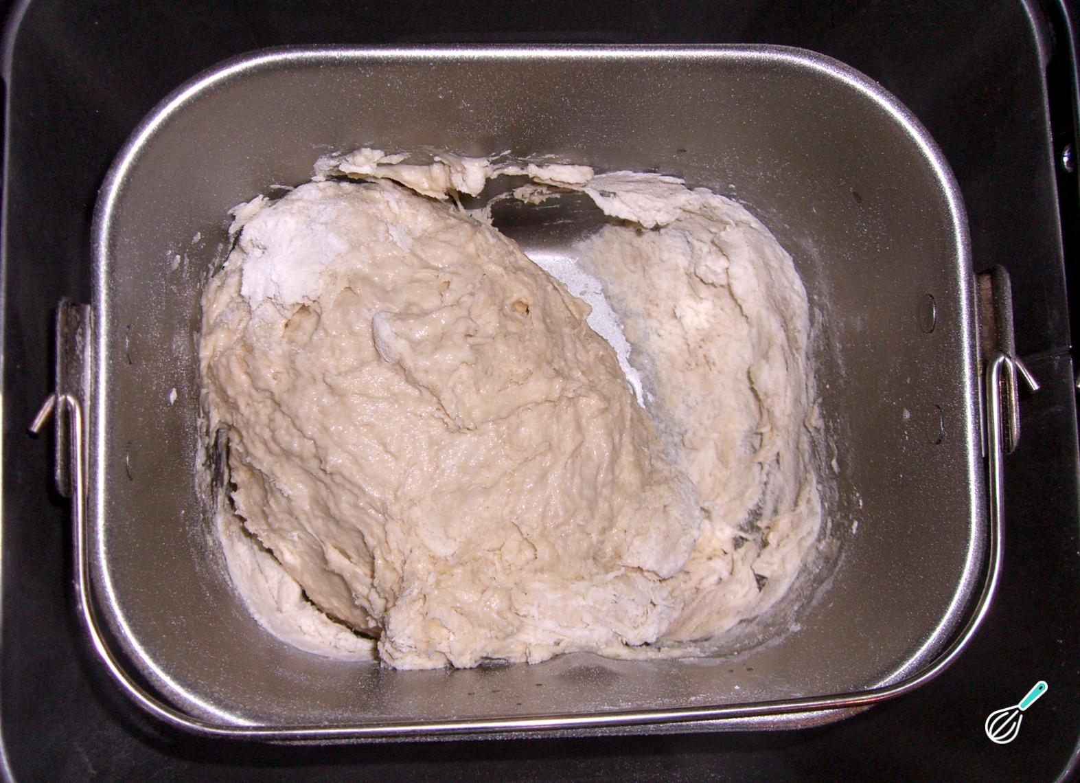 Depois coloque a massa numa forma forrada com papel vegetal (para assar no forno) ou na máquina de fazer pão. Se assar o pão no forno, pré-aqueça-o nos 200ºC e deixe no forno até dourar; se usar a máquina de fazer pão, deixe assar durante 1 hora (na minha máquina usei o Programa 10).