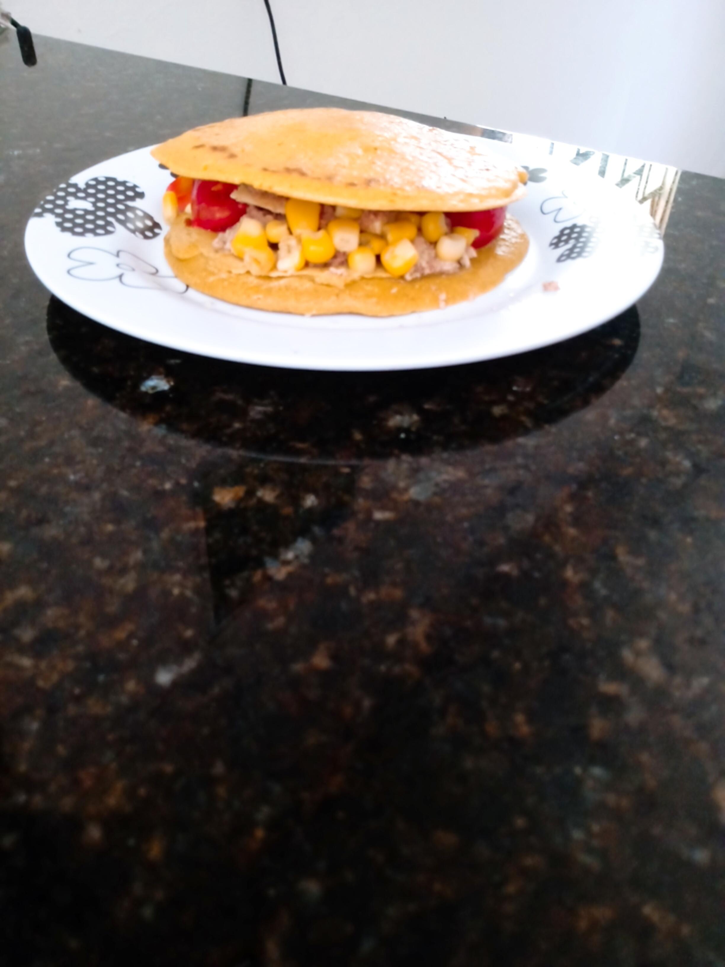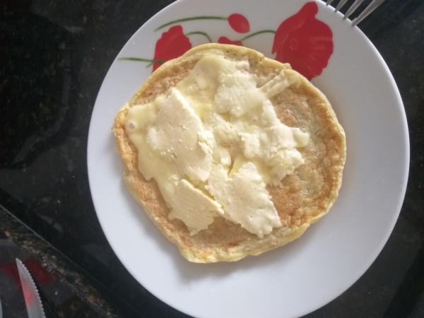 Vire e espere dourar do outro lado também - menos de 1 minuto. Nesse momento pode rechear seu pão de frigideira com o que preferir - eu usei mortadela e queijo mussarela.