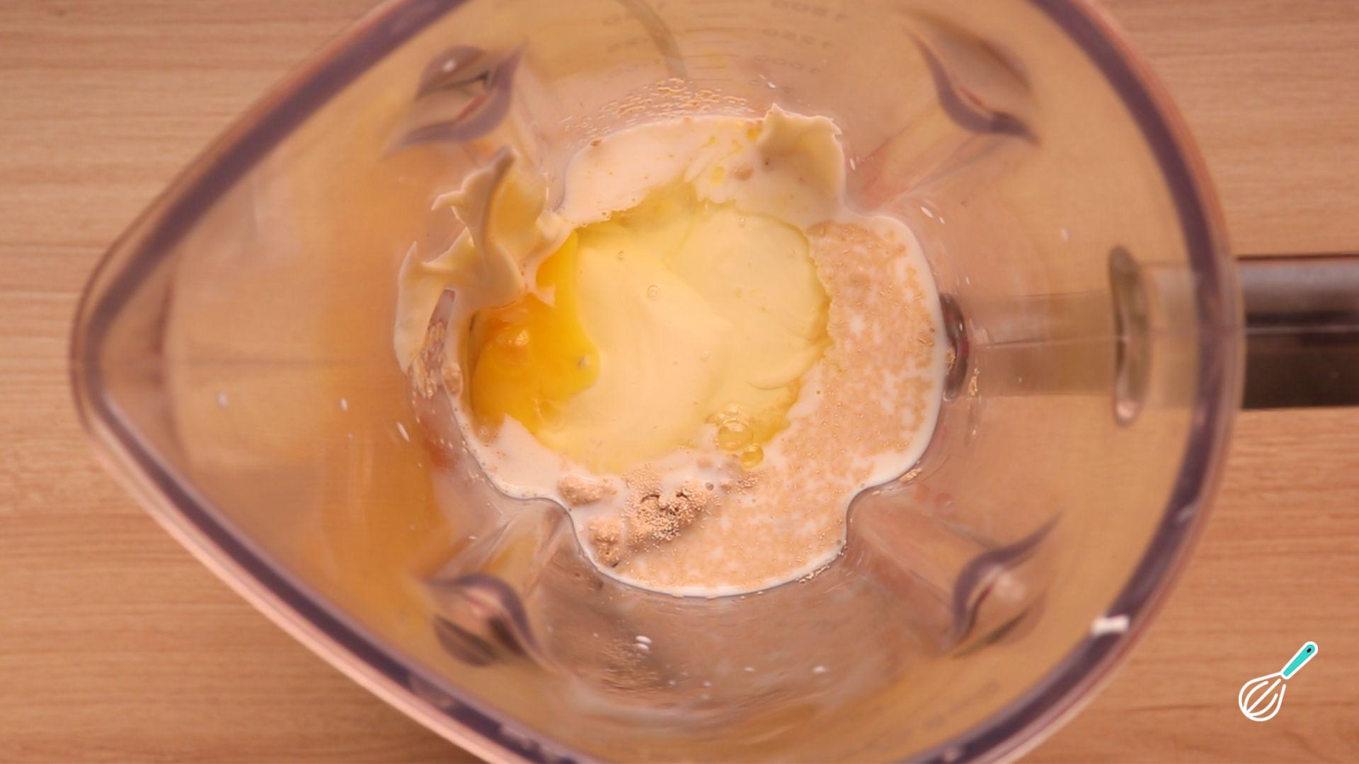 Então vamos começar o preparo desse pão que é super fácil: bata todos os ingredientes da massa no liquidificador, exceto a farinha.