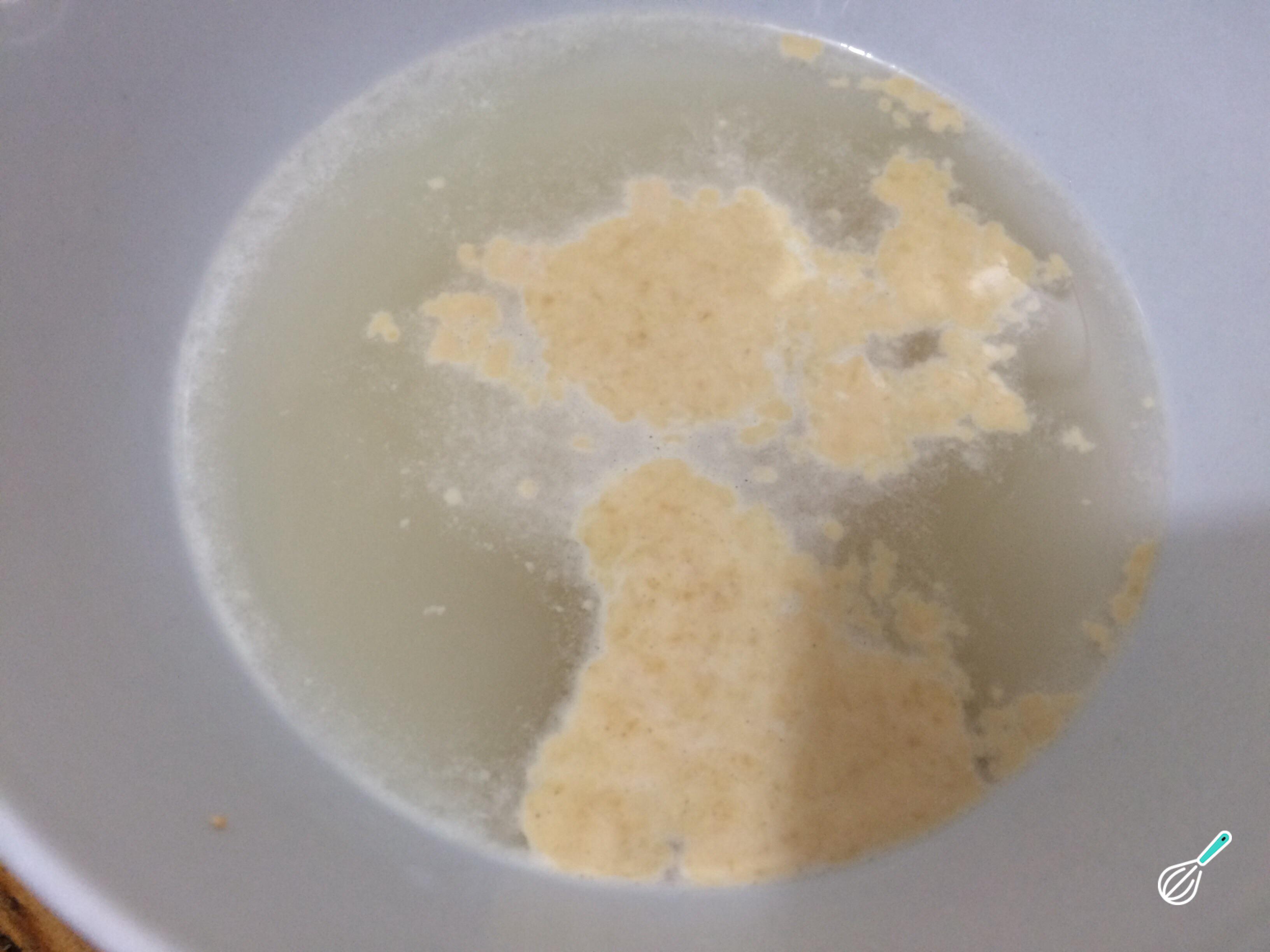Em uma tigela coloque a água, metade do açúcar e o fermento. Deixe repousar por 5 minutos, para ativar o fermento.