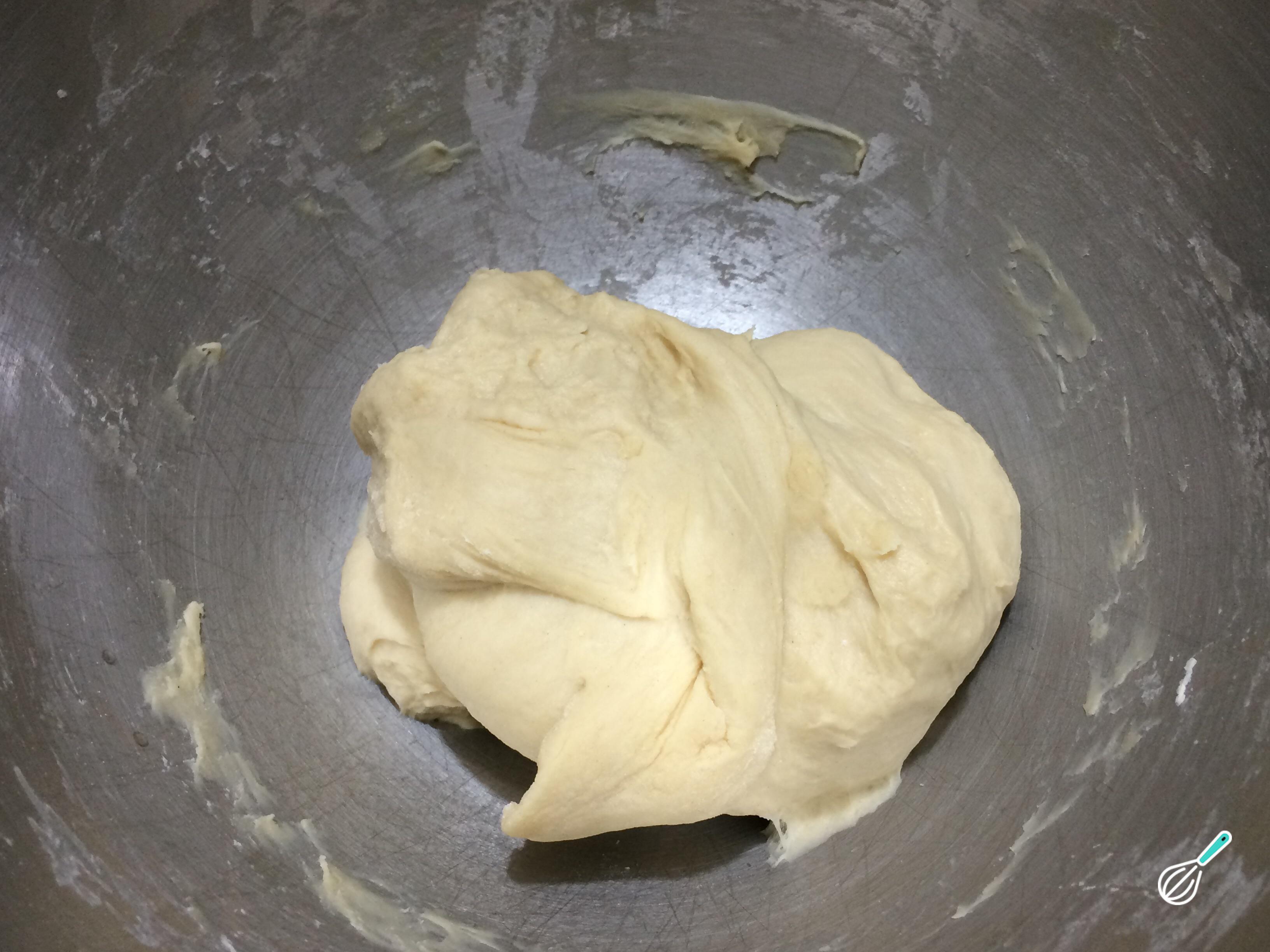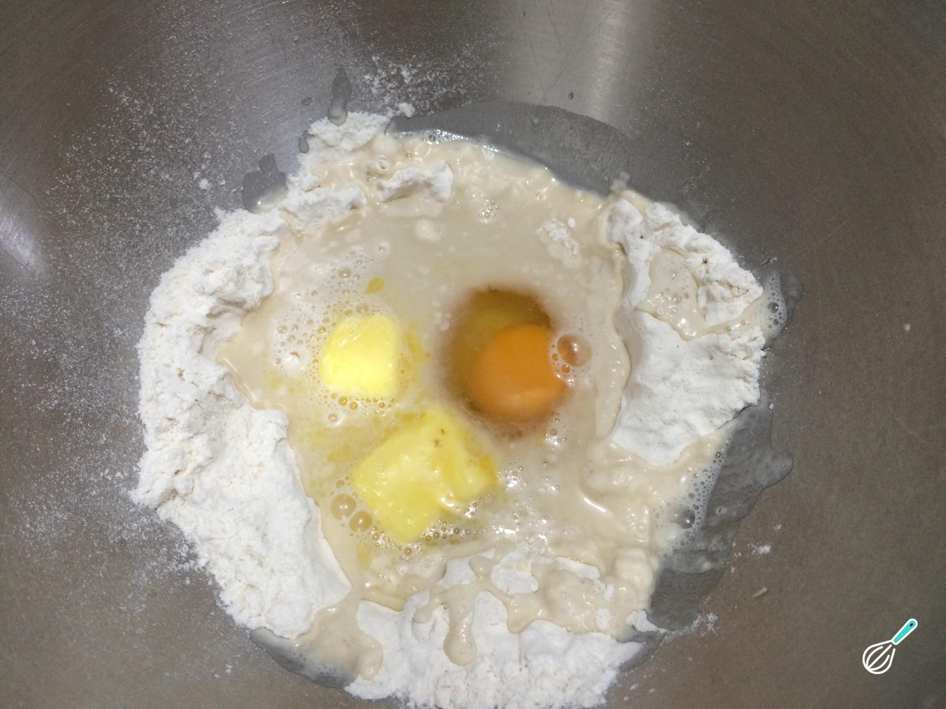 Após o passo anterior, misture em uma tigela a farinha, o sal e o açúcar restante. Acrescente a mistura anterior, a manteiga e o ovo, e misture e sove tudo muito bem por 20 minutos.