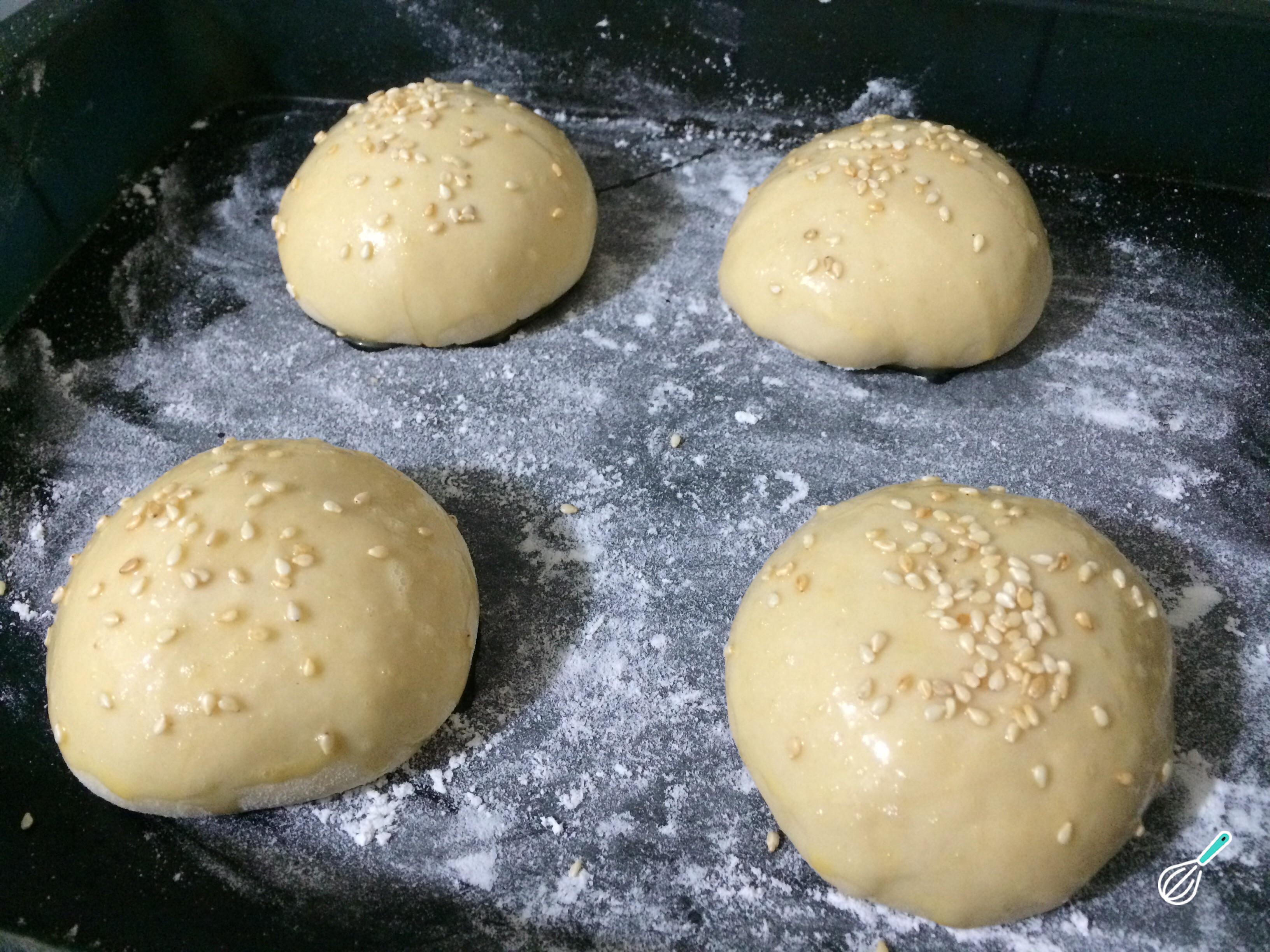 Coloque o pão de hambúrguer em um tabuleiro untado e enfarinhado, pincele com o ovo batido, polvilhe as sementes de gergelim, e leve ao forno preaquecido a 200ºC por 15 minutos.