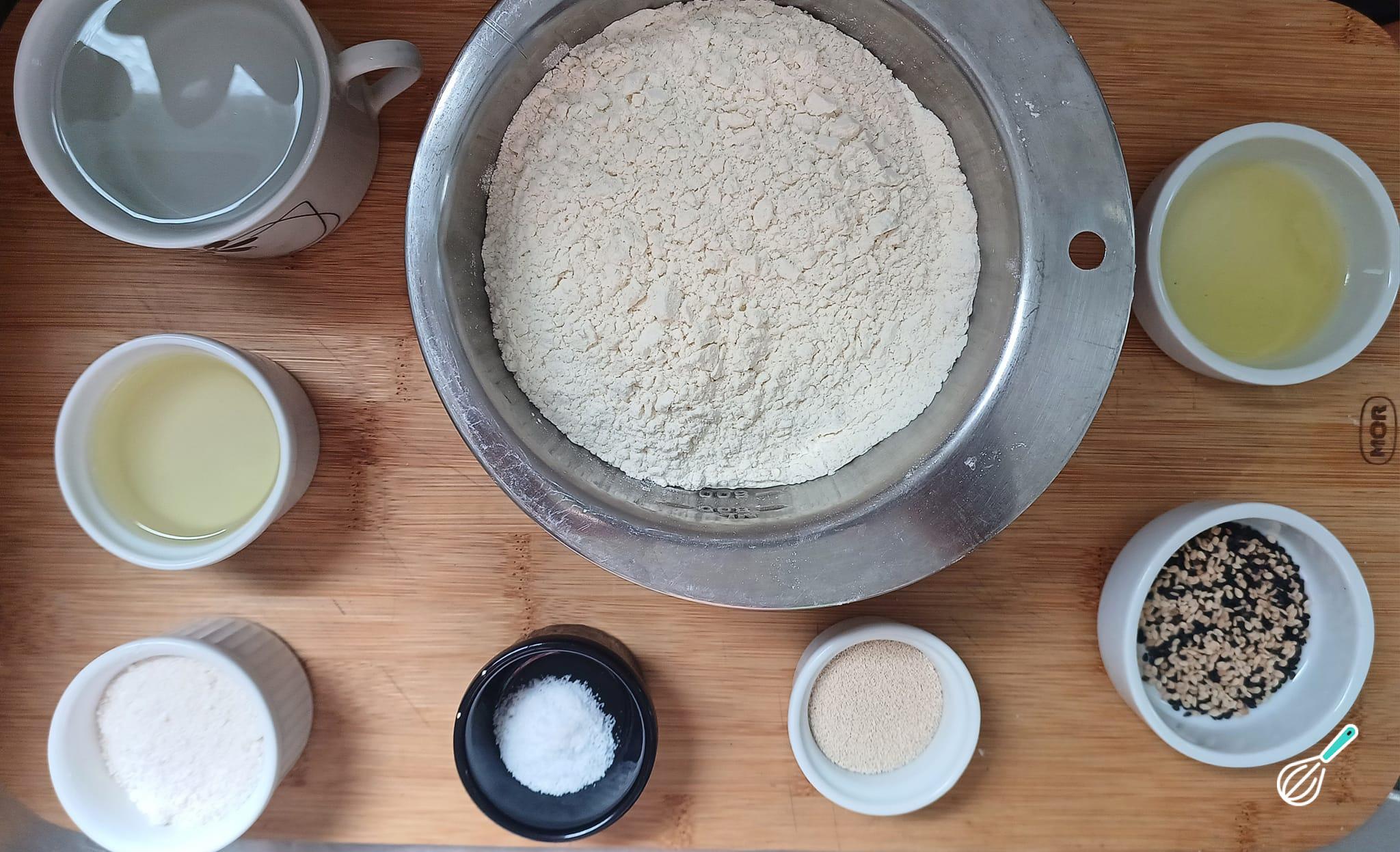 Separe todos os ingredientes necessários para preparar a receita de pão de hambúrguer vegano.