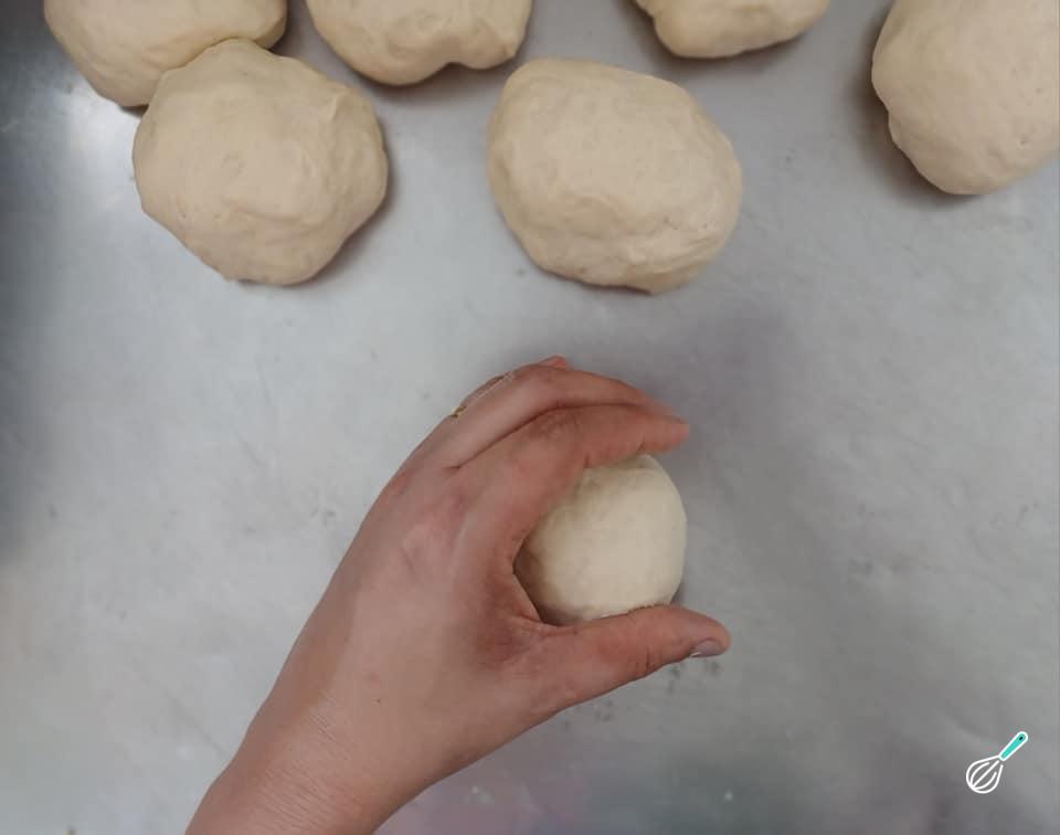 Depois que a massa crescer, divida-a em porções iguais (aqui pesamos cada porção com 90 gramas) e modele-as formando bolinhas, como mostra a foto abaixo.