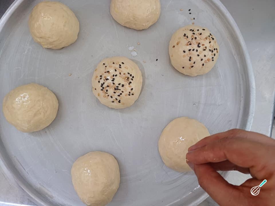Acomode as bolinhas modeladas numa assadeira untada e enfarinhada, dando espaço entre elas, pincele azeite de oliva e decore com sementes de gergelim.