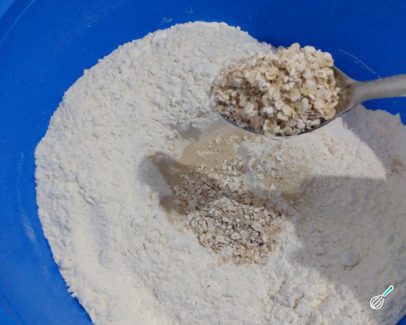 Misture todos os ingredientes secos: a farinha de trigo, o açúcar, o sal, o fermento biológico e a aveia, se você quiser. Pra facilitar coloco estes ingredientes em uma bacia com tampa e chacoalho para misturar bem.