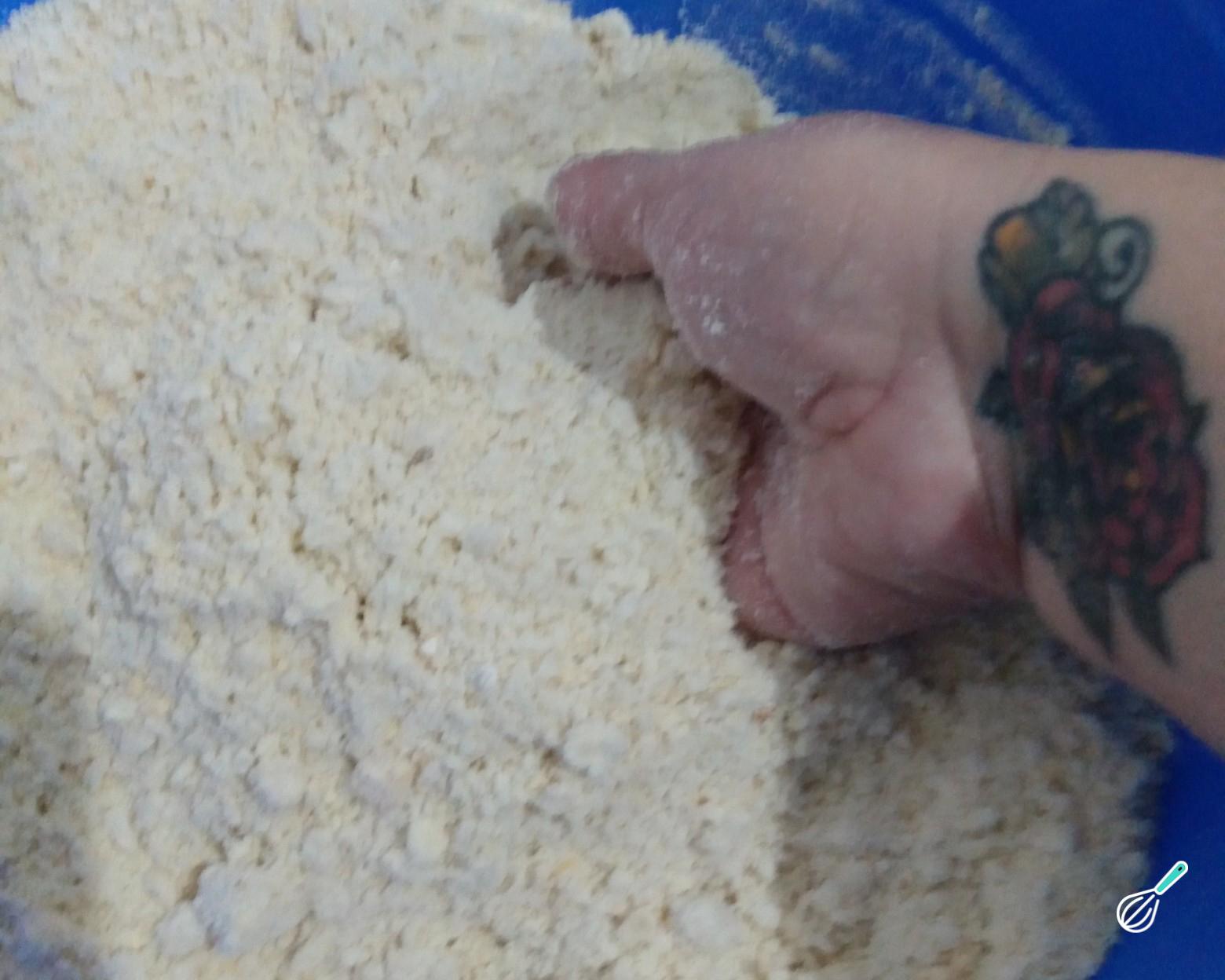 Depois dos ingredientes secos misturados, acrescente o óleo e o ovo levemente batido e misture com as mãos esfarelando os gruminhos que se formam.
